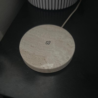 Charging Stone Diameter - 4.65 in | Thickness: 0.82 in | Input: 5V 2A / 9V 1.67A | Wireless output: fast charge | Color: white | Finish: genuine stone | Integrated cable 3ft. Power Adapter - Input: AC 100-240V 50-60 Hz 0.35A | Output: 5V 3A/9V 2A/12V 1.5A.