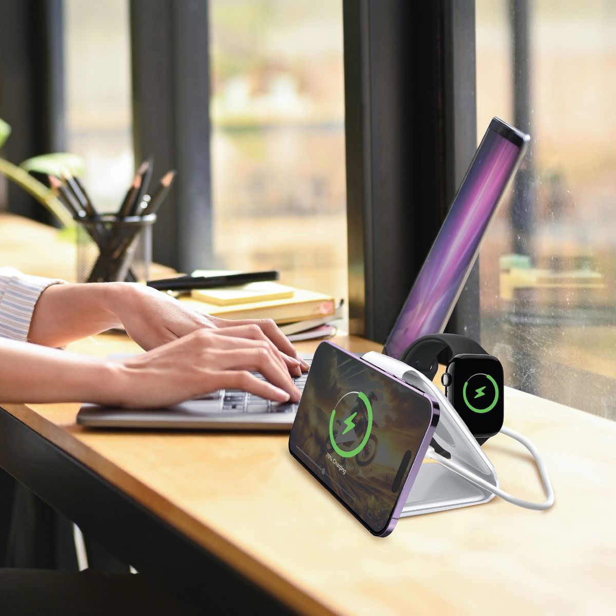 Recharge up to 3 of your digital devices and accessories with ease using this 3-in-1 Foldable Wireless Charger from FISHER® Tech Essentials. This charger works with Apple® devices and Android™ phones that are wireless charging compatible. The portable folding design provides for easy carrying and storage, ideal for travel or daily use. 15-watt fast charging gets your devices charged quickly and efficiently.