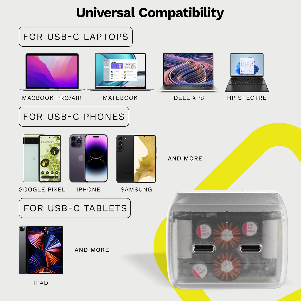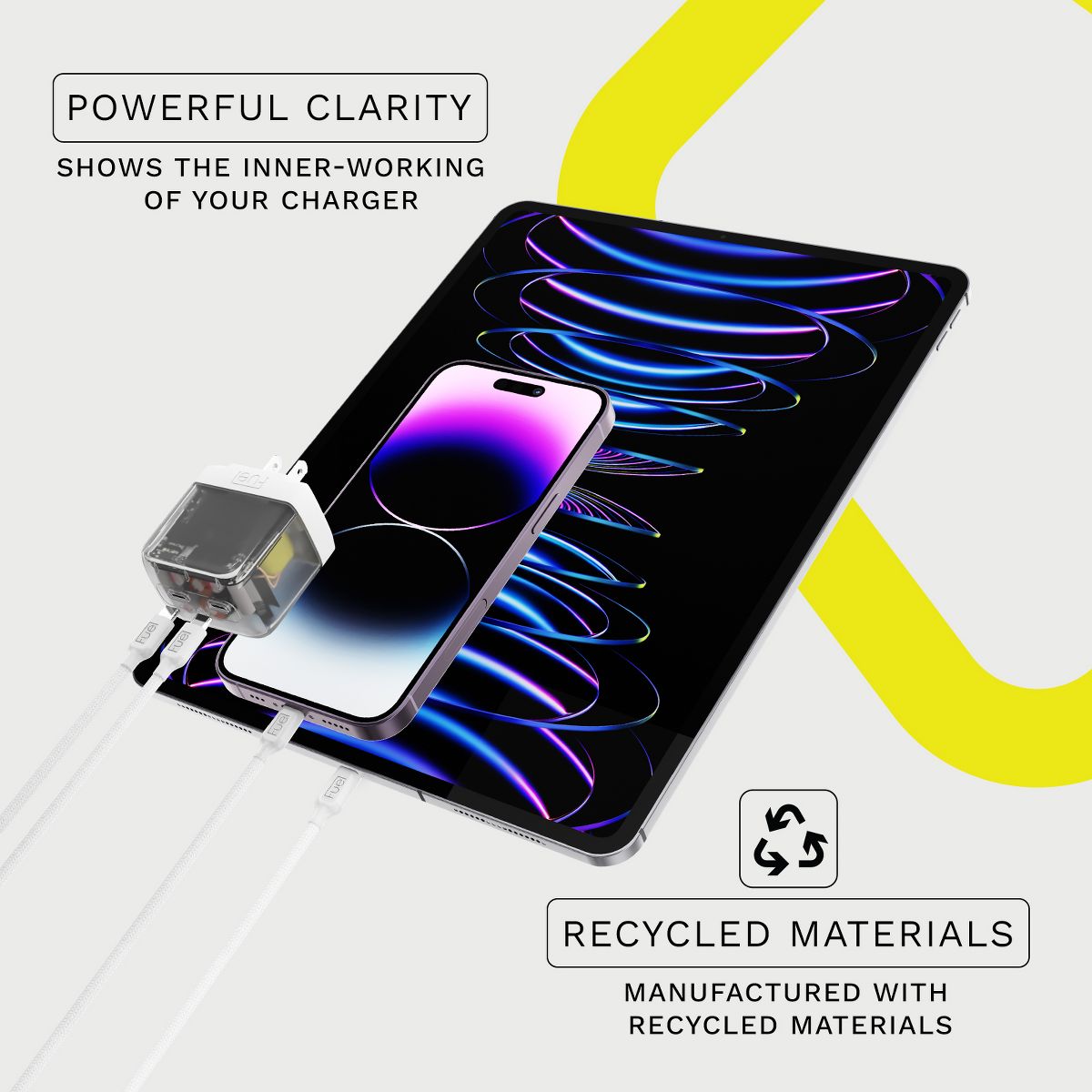 Step up your charging. This semi-transparent 50W Foldable Wall Charger includes two USB-C fast charging ports so you can power multiple devices at once. Smart Charging Technology (SCT) allows the charger to customize speeds based on the device you’re charging, giving you the maximum output allowed (up to 50W). This charger is compatible with Apple, Samsung and other smartphone brands and is perfect for the iPad Pro, iPad Air and any other USB-C compatible tablets. The 50W charger can also be used for the MacBook Pro 13” & 14”.