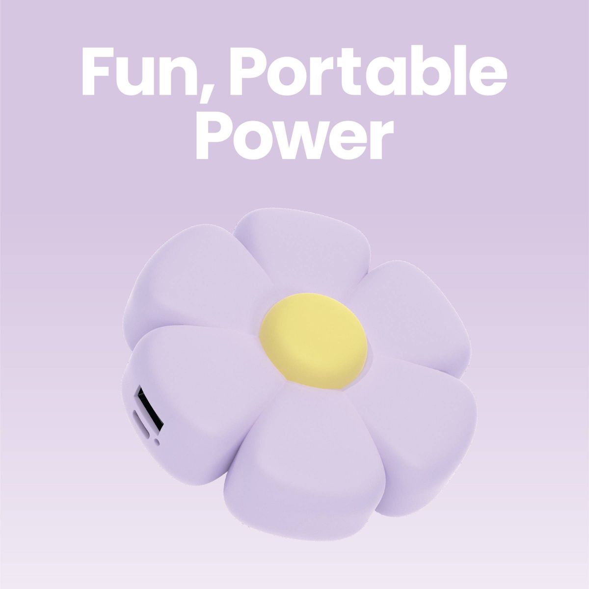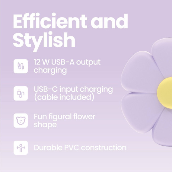 Add a little sunshine to your day with the GEMS Flower Portable Power Bank. Designed with a charming flower shape, this portable charger combines fun style with everyday convenience. The 2,000mAh battery provides quick, reliable charging with 10.5W USB-A output, while the included USB-C cable makes recharging simple. Its durable PVC construction stands up to daily use, and the compact size makes it easy to slip into your bag, purse, or pocket. Perfect for powering up your phone or small devices on the go, this adorable flower power bank keeps you connected in style.