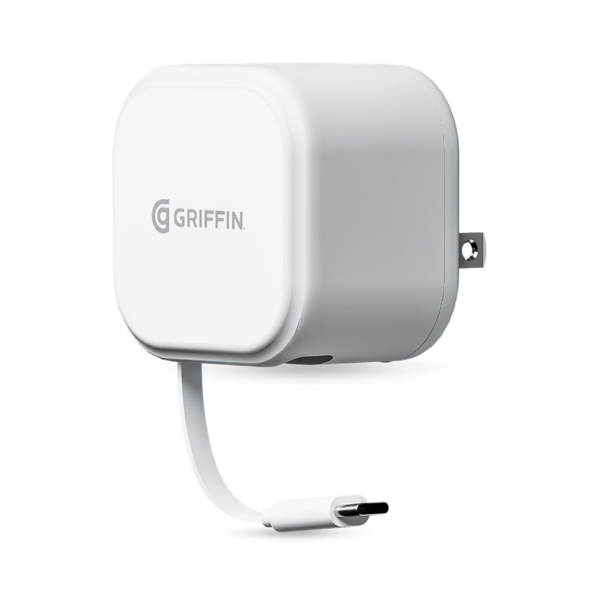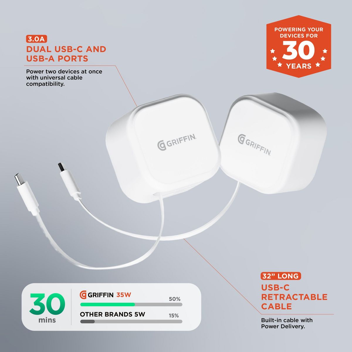 Griffin 35W Dual Port USB Wall Charger with Retractable 20W USB-C Cable, Compact Plug with Foldable Design