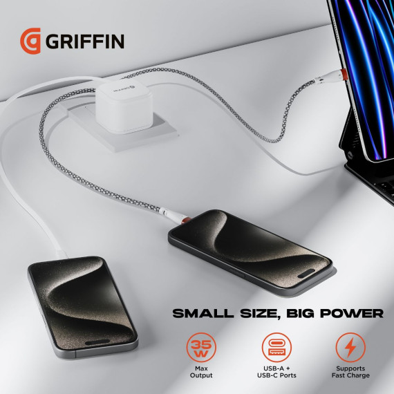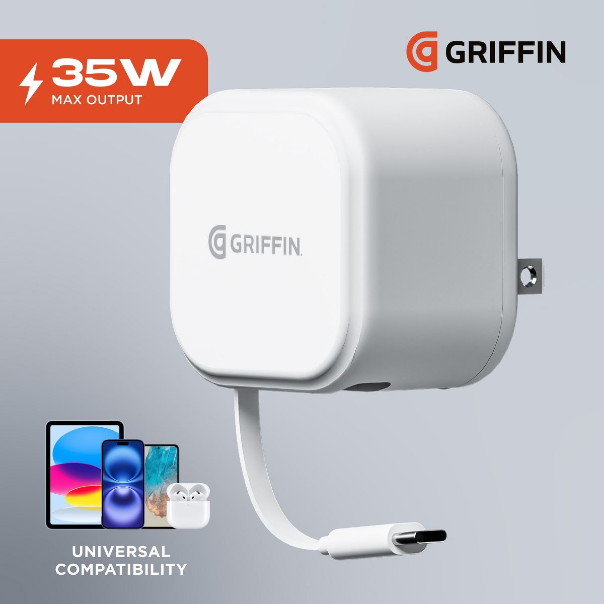Stay fully charged wherever life takes you with the GRIFFIN 35W Dual Port USB Wall Charger with Retractable 20W USB-C Cable. This versatile usb wall charger is designed to simplify your charging routine by offering fast, reliable power for all your essential devices. With a 20W USB-C port and an 18W USB-A port, you can quickly charge two devices at the same time without sacrificing speed or performance. The retractable 20W USB-C cable is built directly into the charger, giving you the convenience of an attached cord without the hassle of carrying extras. Whether you’re at home, in the office, or on the road, this usb c wall plug keeps your devices powered with minimal effort and maximum portability. Thanks to its compact size and foldable plug, this portable charger with wall plug easily slips into your bag or pocket, making it an excellent companion for travel or everyday use. It’s a smart and space-saving solution for those looking for wall plugs with usb ports that deliver both speed and versatility. Compatible with a wide range of devices, including smartphones and tablets, this usb wall plug ensures you’re always prepared to charge on the go. Built with safety in mind, the GRIFFIN wall charger offers reliable power delivery with built-in protection against overcharging and overheating, giving you peace of mind with every charge. Whether you’re searching for cell phone wall chargers, a dependable usb wall adapter, or a powerful usb c wall charger for daily use, the GRIFFIN 35W Dual Port Wall Charger is your perfect charging solution.