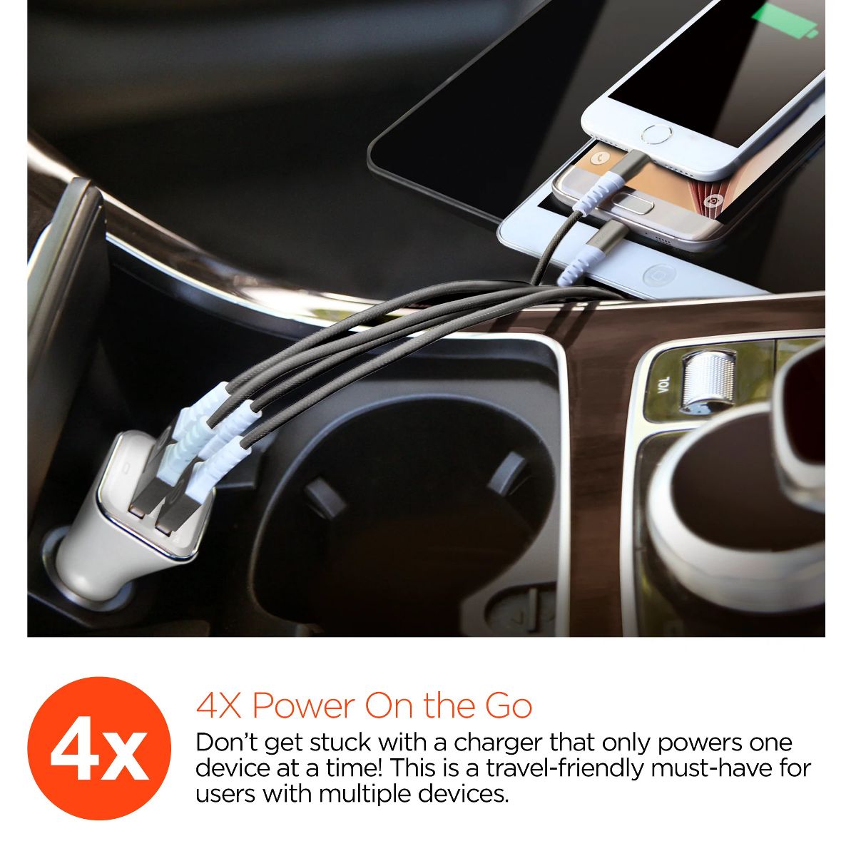 The High-Power Quad USB Car Charger delivers colossal performance from a pocket-sized device. Perfect for power-heavy mobile lifestyles, it features 4 USB ports with an incredible 6.8A combined output. It can rapid charge as many as four devices simultaneously! Say goodbye to bulky chargers that barely fit into your console, the compact and lightweight Quad is designed with a low-profile. Available in rose gold, gold, and silver finishes, as well as classic black and white, this eye-catching accessory is a sleek way to power up on the go. No matter where the road takes you, Always Arrive Fully Charged!