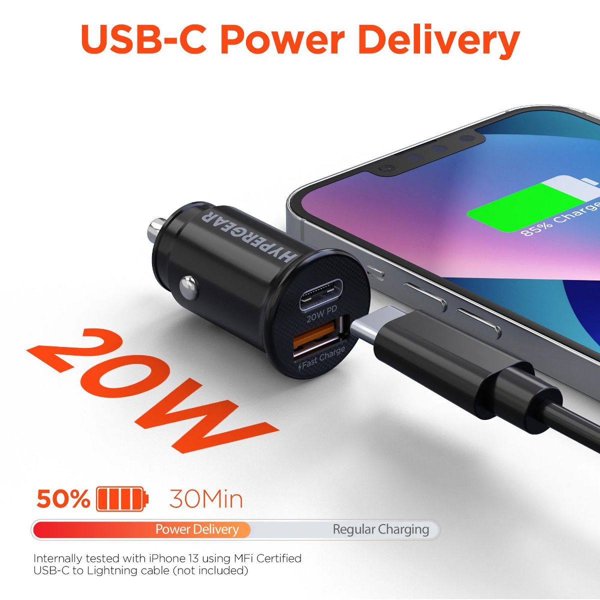HyperGear mini 20W USB-C PD + 18W USB Fast Car Charger | White