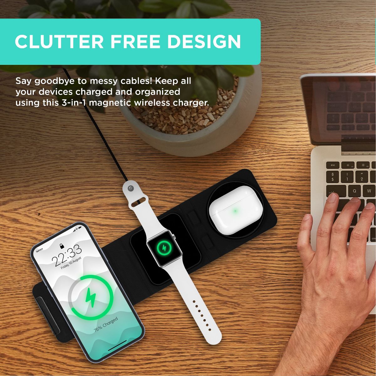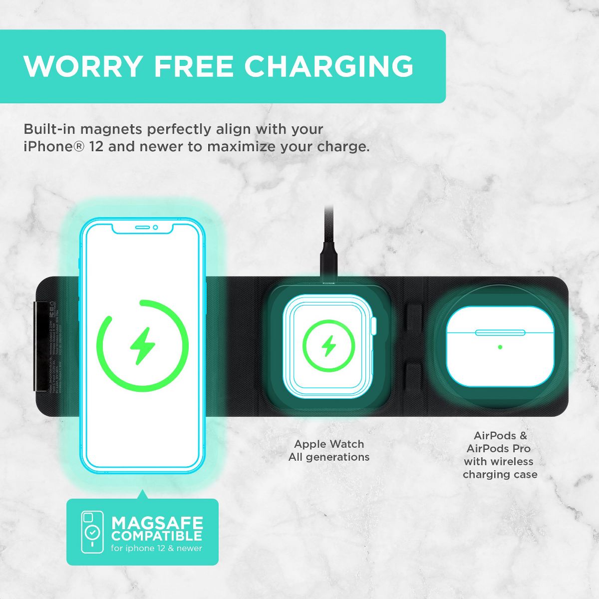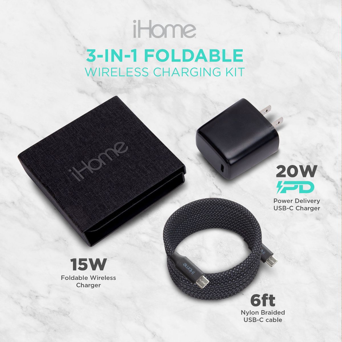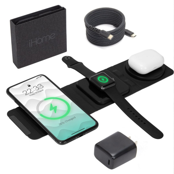 The iHome 3-in-1 Foldable Wireless Charging Kit is your all-in-one charging station, designed for fast, efficient, and space-saving charging. This kit includes a 15W Foldable Wireless Charger, 20W USB-C Power Delivery Wall Charger, and a 6FT Nylon Braided USB-C Cable—everything you need to keep your devices powered up quickly and safely. The 15W Foldable Wireless Charger serves as a compact phone charging station, featuring magnetic alignment for effortless charging of your iPhone (12 and newer), all generations of Apple Watch, and AirPods or AirPods Pro. The charging pad folds for easy storage, making it an ideal portable charger that fits perfectly into your travel essentials. Whether you're at home, in the office, or on the go, this charger ensures your devices are always ready. The 20W USB-C Power Delivery Wall Charger provides fast, efficient charging for all your USB-C devices. With its superior Power Delivery, it efficiently powers the 15W foldable wireless charger and quickly charges your devices. Built for durability, the 6FT Nylon Braided USB-C Charging Cable is designed to withstand daily use, resisting tangling and wear. It provides a reliable connection whether you're using it at your desk, couch, or in the car—making it a great addition to your phone charging station setup. Ideal for anyone with multiple devices, the iHome 3-in-1 Foldable Wireless Charging Kit offers universal compatibility, giving you a charging station that works with all your gadgets for a seamless, hassle-free charging experience.
