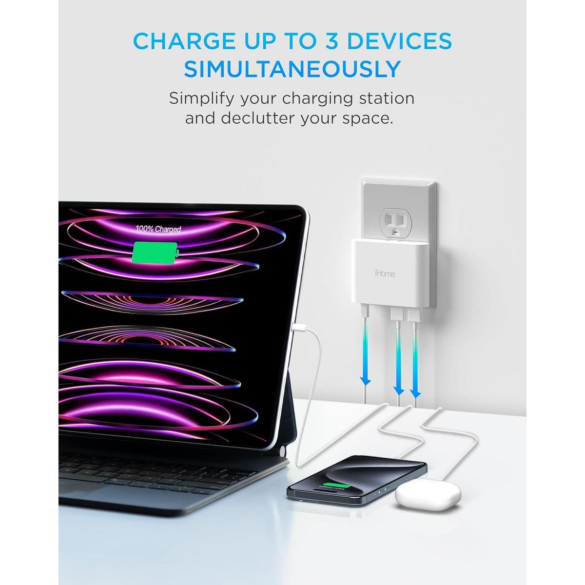 iHome 32W AC Pro Multi Port USB Wall Charger - Charging Station with 3 Ports (1 USB-C, 2 USB-A) Fast Charging, Universal Compatibility