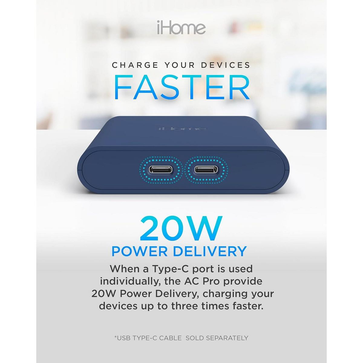 Charging blocks are a thing of the past with the iHome Multiport 40W USB-C Charger, which turns a single AC outlet into a multi-USB charging hub. Experience the power of a fast charging block, enabling you to power two devices at once, eliminating the need to wait for one device to charge before plugging in another.