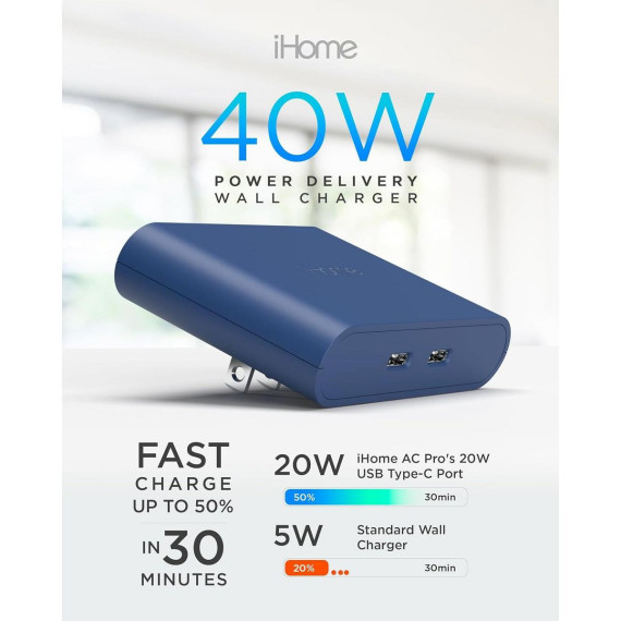 iHome Multiport 40W USB-C Charger, AC Pro 2-Port Flat Block, Dual Fast Charging Wall Adapter