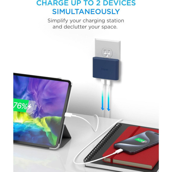 Our 2 port wall charger USB-C doesn't just allow you to charge one device quickly, but two devices simultaneously, making it a highly efficient USB wall charger. Whether you need to power up your iPhone and iPad at the same time or have multiple devices that need charging, this USB wall plug streamlines your charging process.