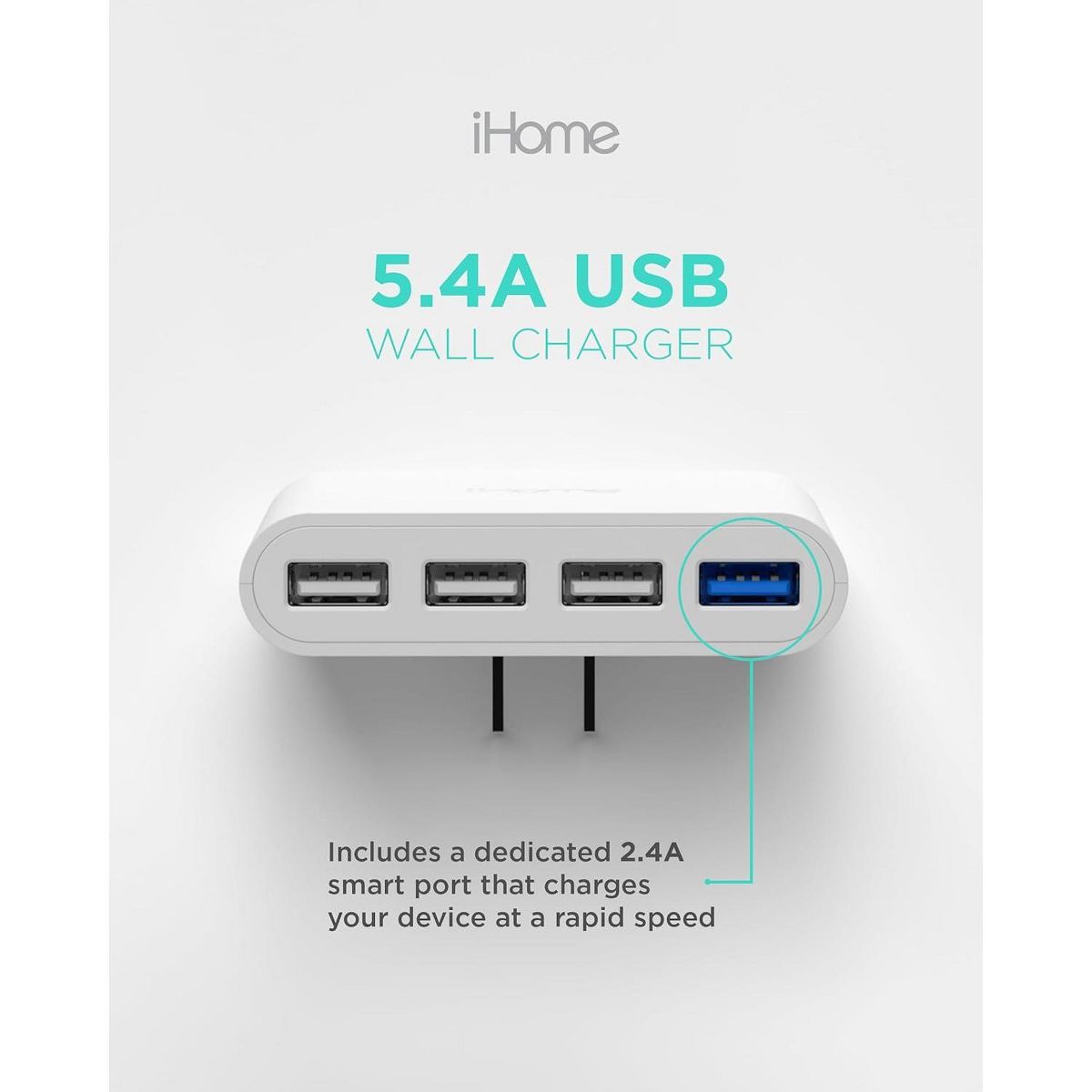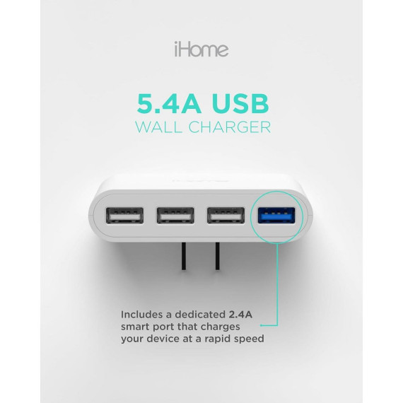 4 PORT USB POWER ADAPTER: iHome's phone wall charger block is a usb adapter plug that converts a single AC outlet into a multiple usb charger, allowing you to charge up to 4 devices at the same time! FLAT USB WALL PLUG: Our USB charger block is flat and not bulky like other USB blocks. iHome's flat usb wall charger and USB plug offers a slim design that allows you to easily access hard to reach outlets that are behind furniture or other tight spaces. RAPID CHARGING BLOCK: iHome's USB wall charger multiport includes a dedicated 2.4A port to rapidly charge your phone or tablet twice as fast as other standard charging blocks FOLDABLE PRONGS: You won't find another iPhone block wall charger that fits as easily into your bag or suitcase as the iHome AC Pro 4 USB wall charger. WALL CHARGER WITH USB PORTS: The AC Pro is one of the most unique cell phone wall chargers on the market- our rapid fast charging block allows you to charge your iPhone, Android, iPad, AirPods, and more all at once with any of the 4 USB charging ports.