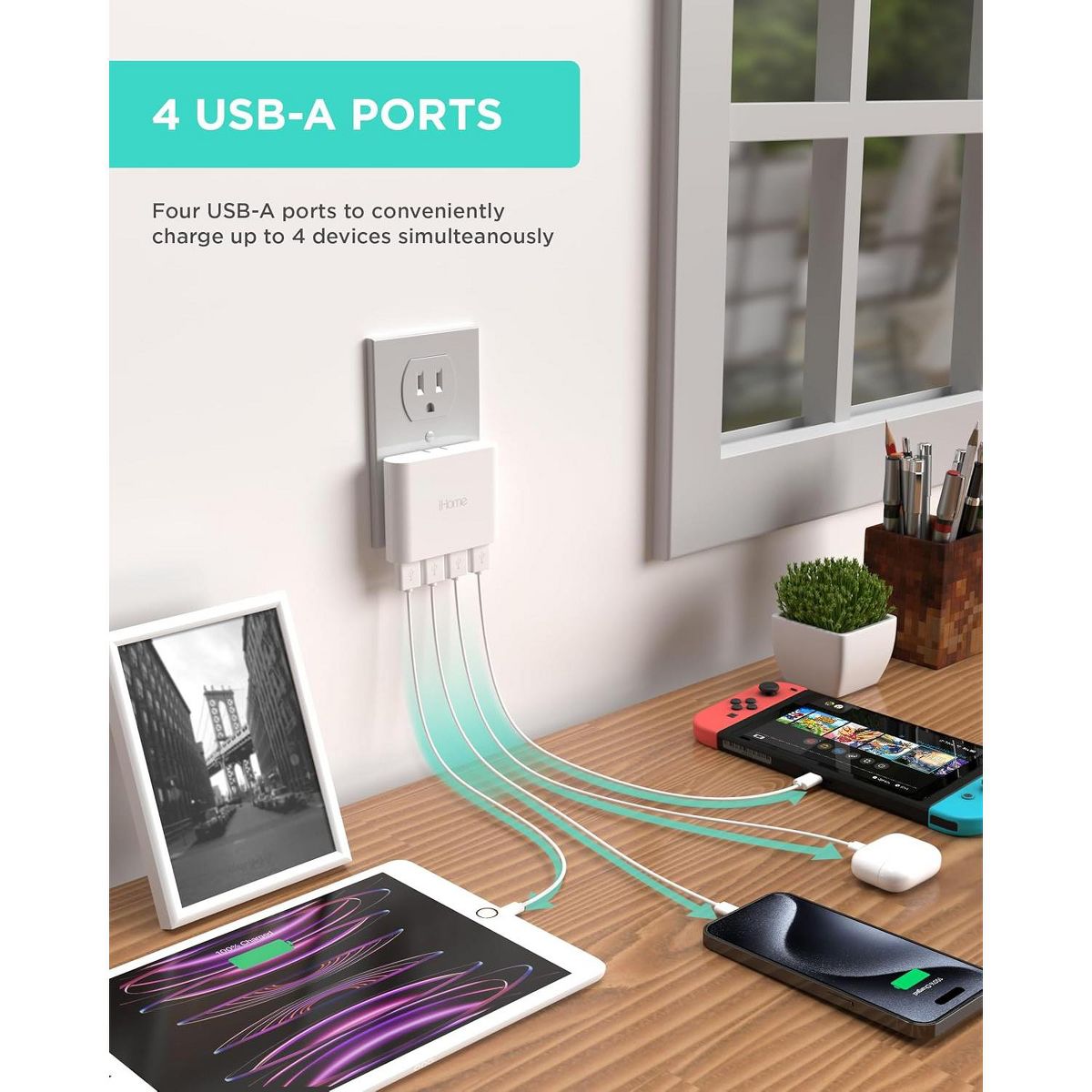 iHome Slim 4-Port USB Wall Charger, AC Pro Multiport Plug Adapter, Phone Charging Block with 4 Ports, Flat USB Wall Adapter for Home & Travel