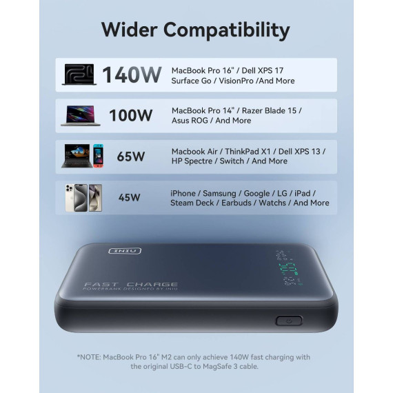INIU Leopard Power 140W—your ultimate travel companion! This compact 25,000mAh power bank, featuring INIU's TinyCell and HyperStack technology, shatters the limits of traditional chargers. Say goodbye to bulky bricks! With an impressive 140W PD 3.1 output, it powers high-demand devices effortlessly. In just 30 minutes, charge your MacBook Pro 16" to 59%, SteamDeck to 57%, and more. It’s perfect for all devices—from the latest iPhones to gaming consoles and smartwatches. Experience universal compatibility and rapid charging wherever you go! What's more, you are also back up with industry-leading 3-year warranty!