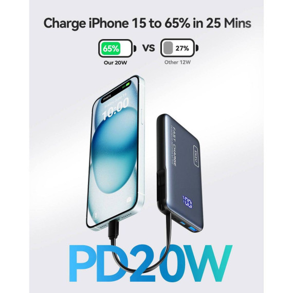 This 10000mAh power bank features PD20W fast charging and a built-in USB-C cable that doubles as a lanyard, eliminating extra cables. Its compact design is 25% smaller and 15% lighter than the same capacity. Rapidly charge your iPhone 15 to 65% in just 25 minutes. What's more, you are also back up with industry-leading 3-year warranty!