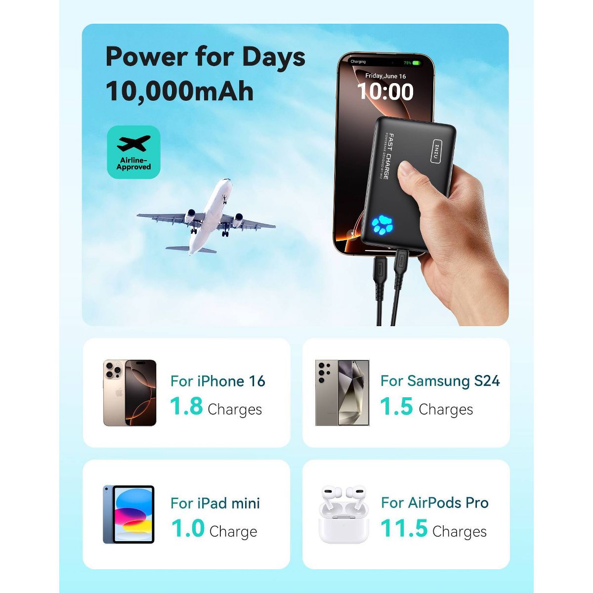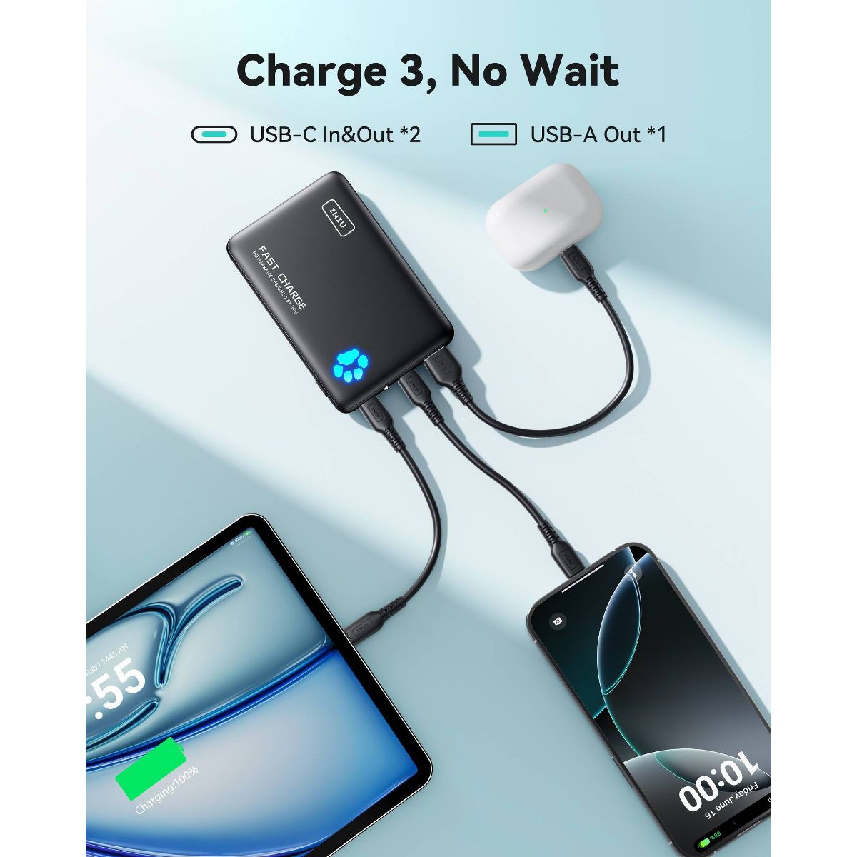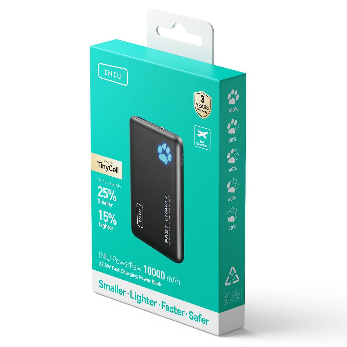 Meet the INIU PowerPaw 10K – the ultimate portable charger that combines cutting-edge technology with unmatched convenience. This ultra-lightweight, ultra-slim 10,000mAh power bank is 25% smaller and 15% lighter than competitors, slipping effortlessly into your pocket or bag for true all-day portability. Experience lightning-fast charging that fuels your iPhone 16 Pro Max up to 75% in just 30 minutes – so you can power up in no time. With triple-device charging capability, you can simultaneously charge your phone, earbuds, and tablet without missing a beat. And with our industry-leading 3-year warranty, you can trust INIU to keep you powered wherever life takes you – because your devices deserve reliable energy that keeps up with your fast-paced lifestyle.