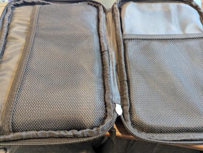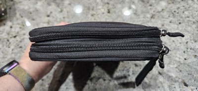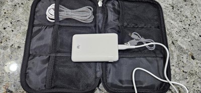 This is a handy kit with the AC/DC adapter with two output options: USB-C and USB - A which takes up one fewer plug when charging devices while traveling. The included battery pack is tiny though, it's only got 5000 mAH capacity which gets me less than half a full charge on my phone. It's useful as a rescue device if you're running on empty and have no wall outlet to plug into but it won't be useful for longer periods like camping or during power outages. I prefer to keep much more robust battery packs in the 20-28k mAH range for more power. A flat pack would fit in this zipper pouch, the more square block shaped packs will not. I'm hoping the rest of our electronics charging equipment will fit in here.