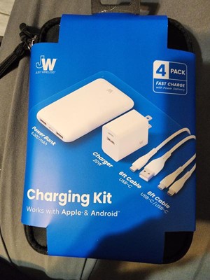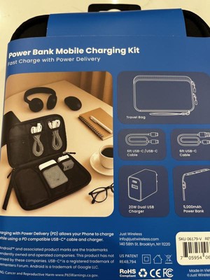 The Just Wireless 4-Pack Charging Kit is the all-in-one solution for powering your devices at home, at work, or on the go. The bundle includes a 20W Dual USB wall charger (USB-A and USB-C), a 5,000mAh portable power bank, and two extra-long 6ft cables—one USB-A to USB-C and one USB-C to USB-C—providing maximum versatility.