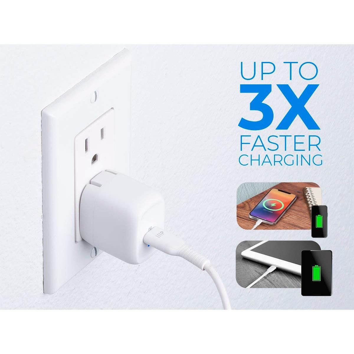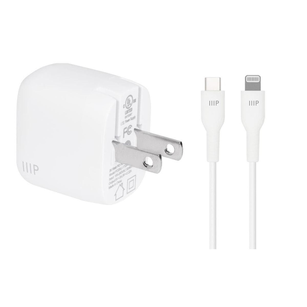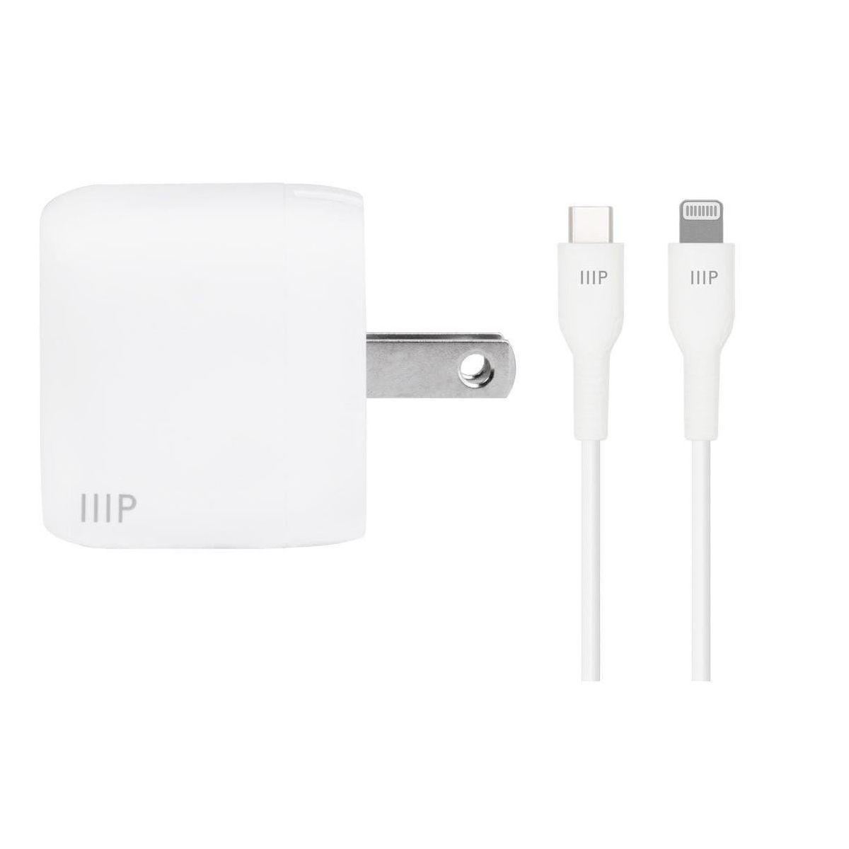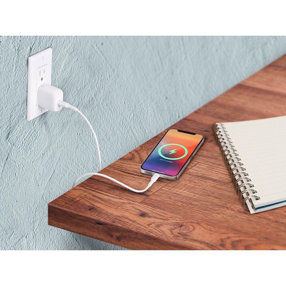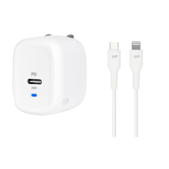 Get all you need to charge and sync your i-Phone* faster and safer than ever in one complete package! Rid yourself of outdated chargers along with their bulky sizes and slow charging speeds. Upgrade to an ultra compact, efficient, safe, and powerful USB Type-C charger with Gallium Nitride (GaN) technology from Monoprice! Gallium Nitride is a superior material for semiconductors than traditional silicon, with higher voltage levels, need for fewer supporting components, and more efficient current transfer. This means there is less power loss to heat, a smaller form factor, and significantly faster charging than silicon-based chargers. Featuring 20W of Power Delivery (PD), this charger provides the fastest and most efficient charging for Lightning port equipped Apple iPhone and iPad, products requiring up to 20W power delivery. *iPhone 12/11/Pro/Max/XR/XS/X and earlier, plus Lightning equipped iPad models.