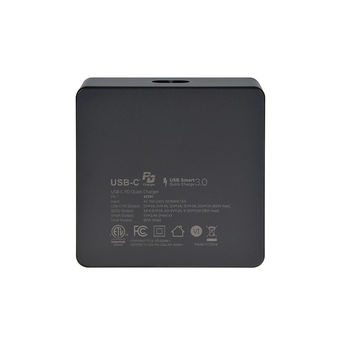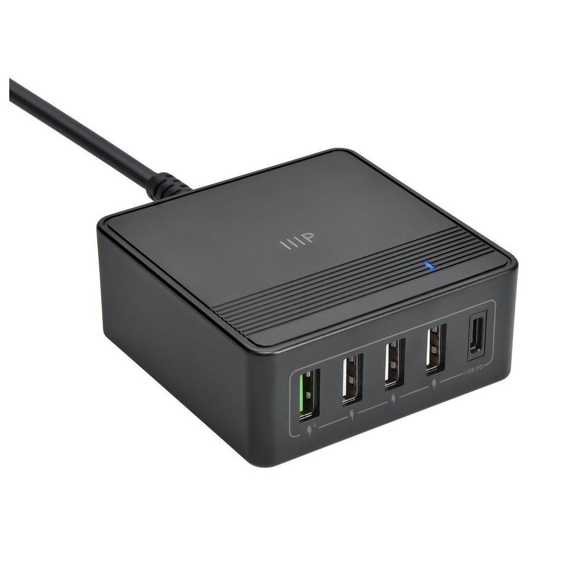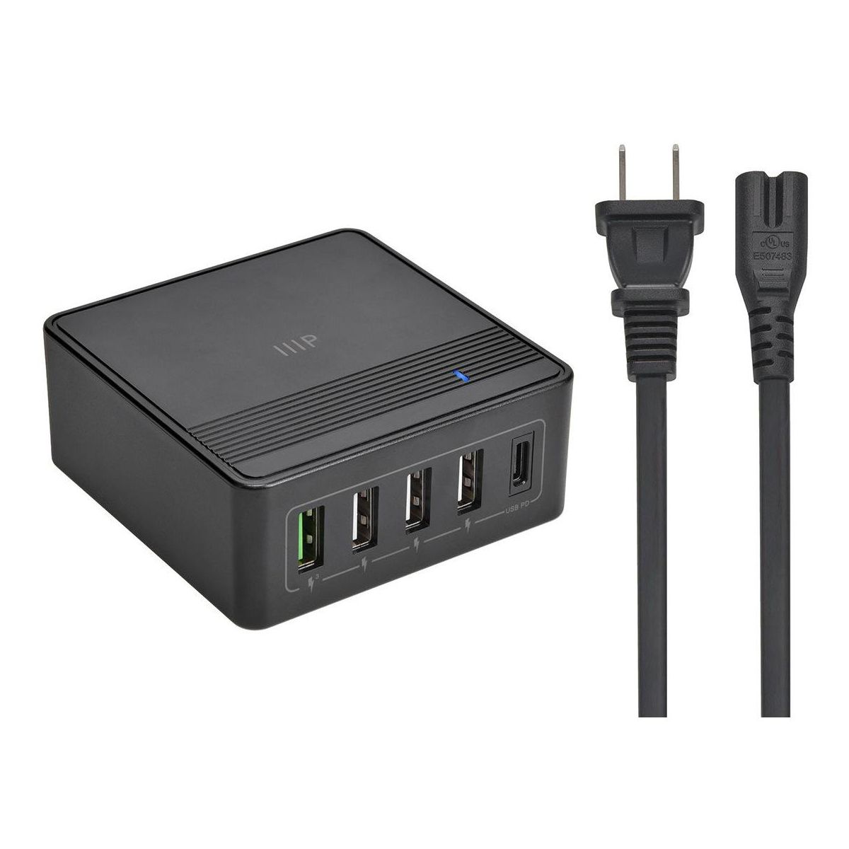 Charge all your USB powered devices using the 60W USB C 5 Port Desktop Charging Station from Monoprice. This 5 port charging station includes both USB Type C and Type A ports for compatibility with the overwhelming majority of USB powered devices. The Type C port can deliver up to 60W of USB Type C Power Delivery (PD), allowing it to charge laptops, even while they are in use. It can also charge a USB C tablet or phone from 0% to more than 50% charge level in less than 30 minutes. Fast charging is not limited to the USB C port. One of the four Type A ports features Qualcomm Quick Charge (QC) 3.0 fast charging, with up to 18W of power to charge compatible devices up to 3 times faster than standard battery charging. The remaining Type A ports each provide up to 5 VDC, 2.4A (12W) charging power. The internal circuitry in the charging station intelligently allocates power to charge each connected device with the optimal level of power for best overall performance. The compact and lightweight design is easy to pack in a laptop bag, backpack, tote, or purse for easy and fast charging on the go.