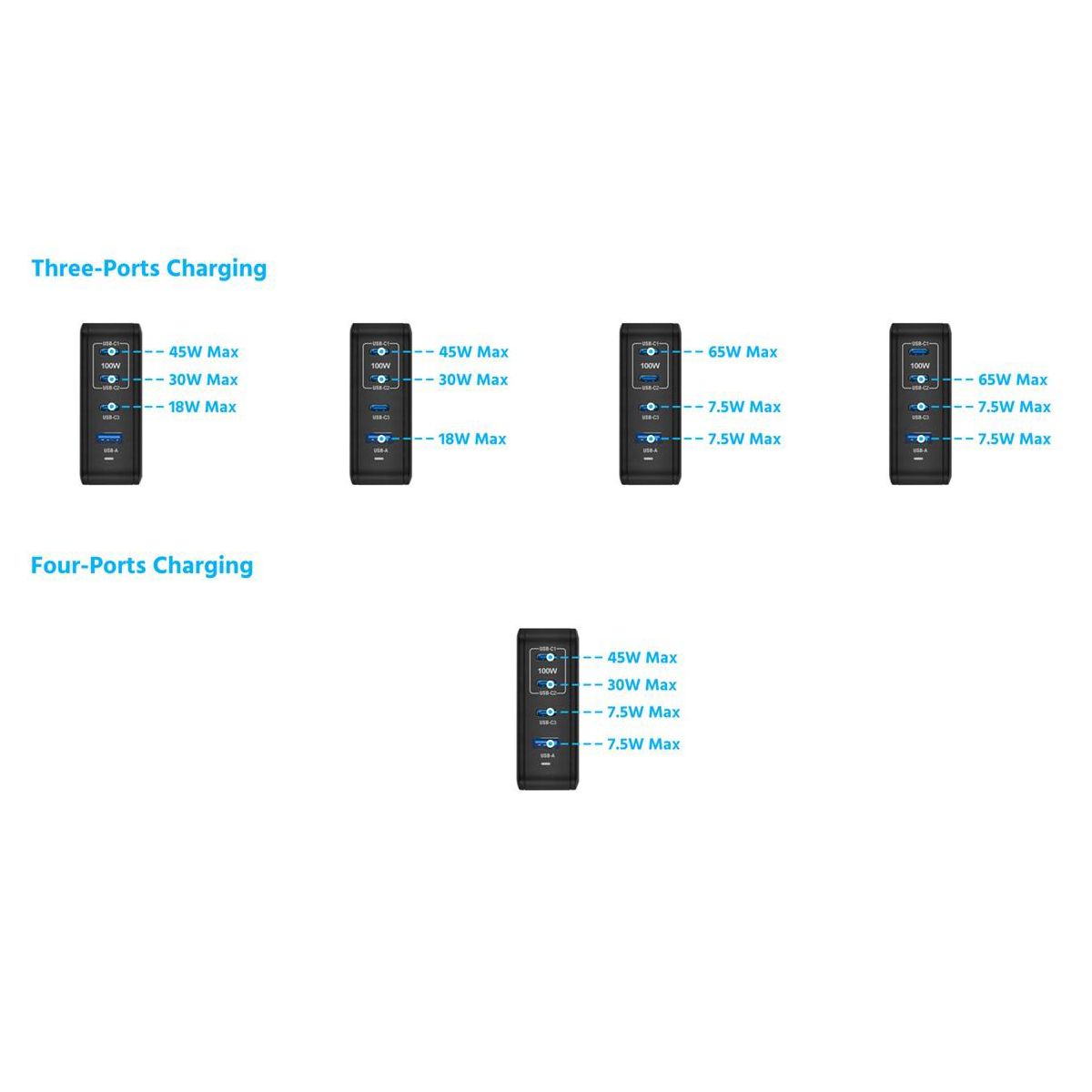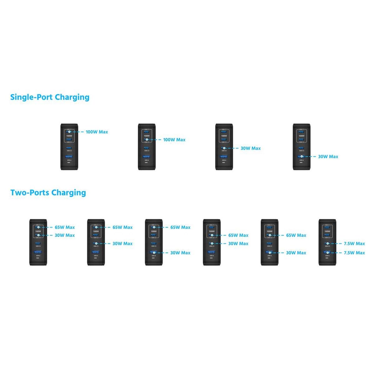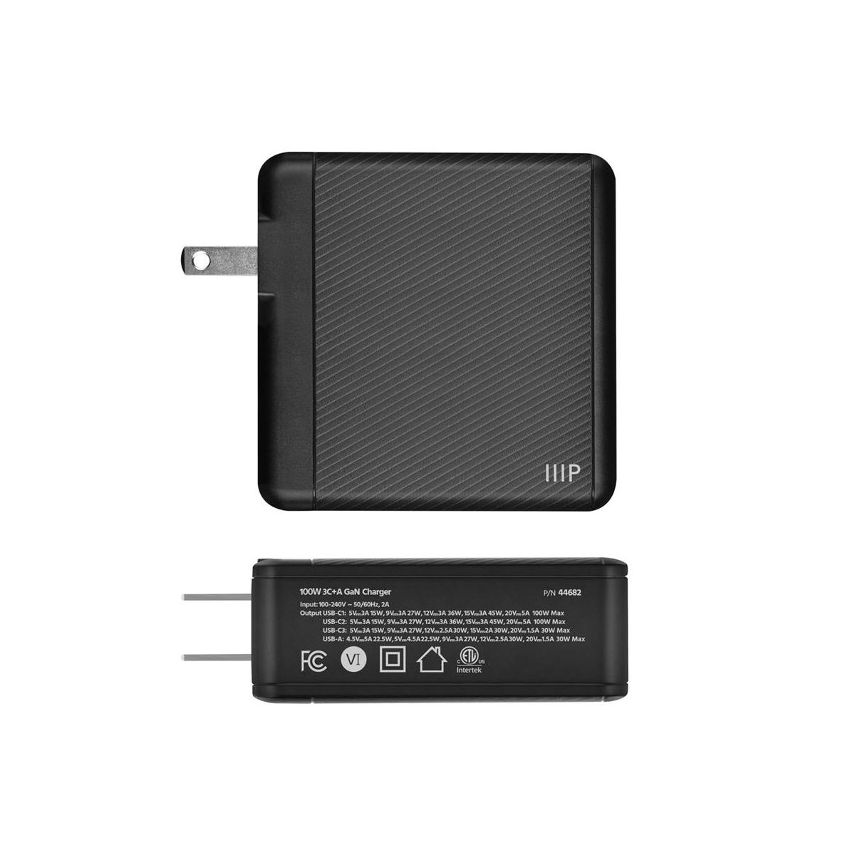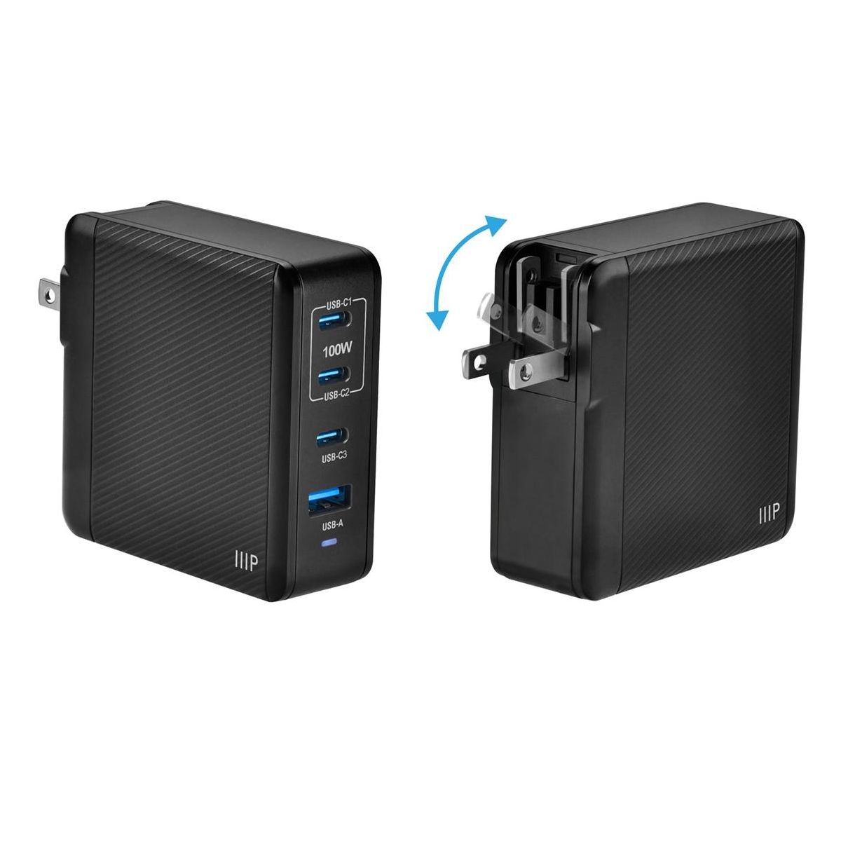 The Monoprice Compact 4-Port 65W GaN Charger is an all-in-one powerhouse that charges multiple devices. With USB Power Delivery technology, two Type-C® ports supply up to 100W single-port output—that’s more than enough to fast charge popular full-sized notebook computers (like the MacBook Pro®, MacBook Air®, Dell XPS™, and ThinkPad® laptops). It is also powerful enough to charge up to two laptops at once—a full-sized one (like a MacBook Pro® laptop) and a lighter-weight one (like a MacBook Air® laptop). Charge up to 4 devices simultaneously, like phones, tablets, and laptops, with Intelligent Power Distribution technology automatically allocating the optimal amount of power to each device, and never worry about overcharging any device. GaN technology increases power efficiency while shrinking the circuit size, providing a compact architecture perfect for fitting into small spaces or taking with you on the go. The folding prong design is there for easy and travel-friendly packing. Our chargers are tested and certified by independent ETL-certified labs to ensure safe performance and protection from overheating, overcharging, excessive current, and short circuits.