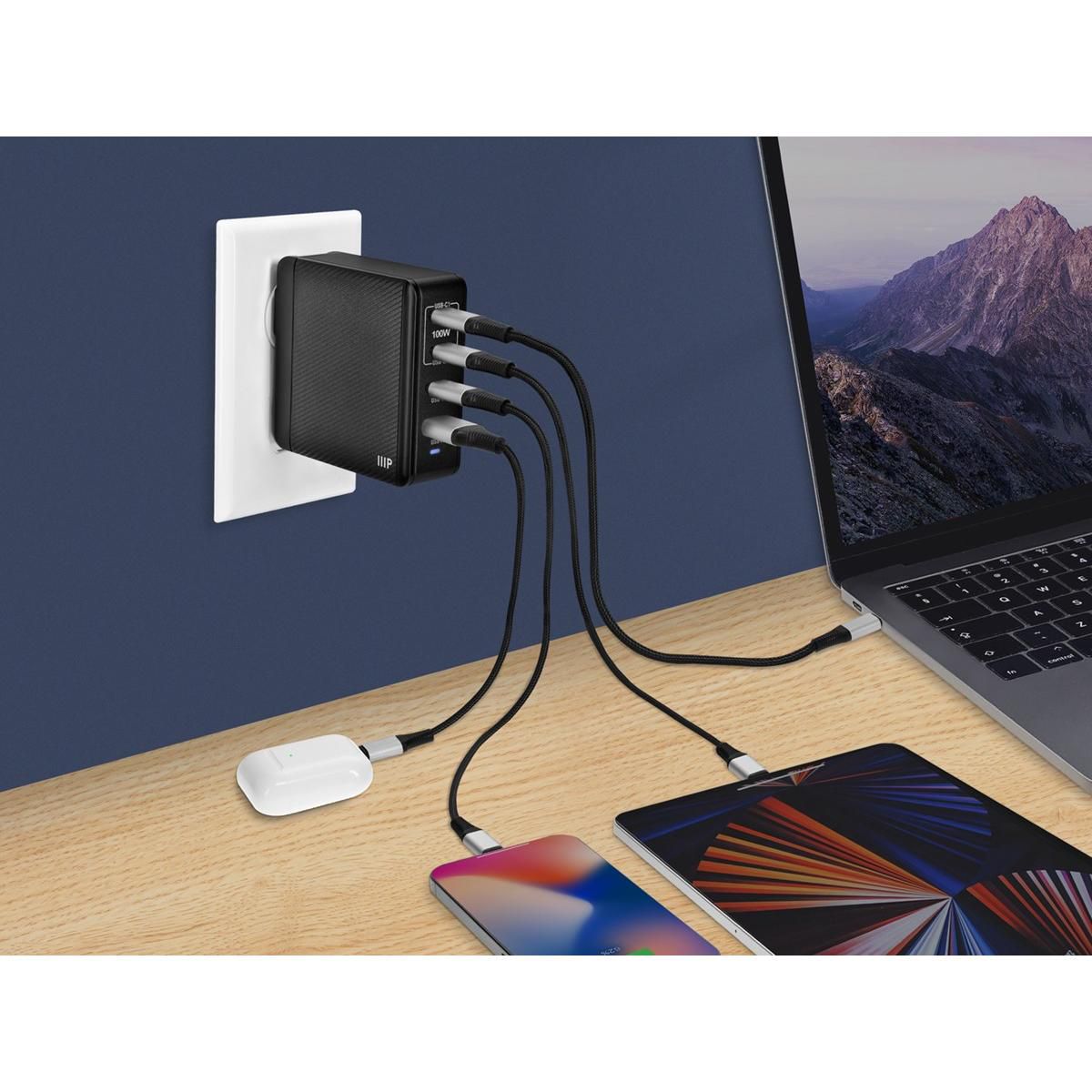 Monoprice Compact 100W 4-Port GaN Charger, Fast Charge, 3x USB-C & USB-A, Universal Compatibility