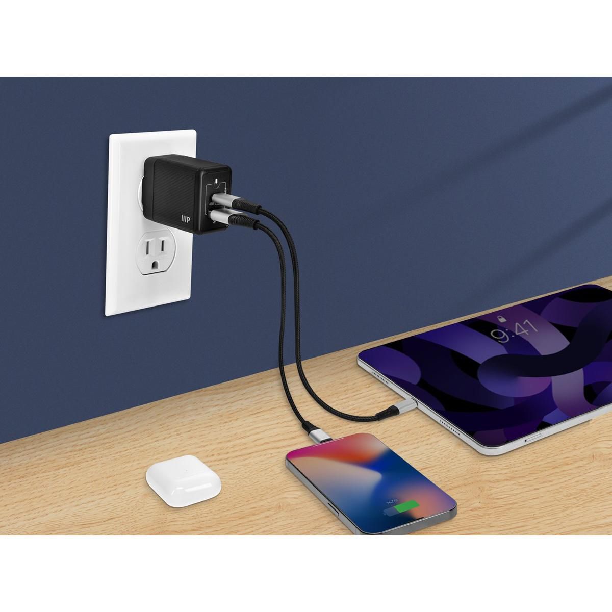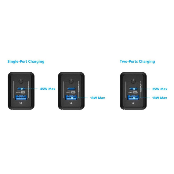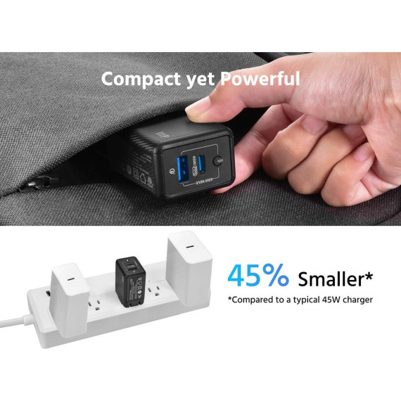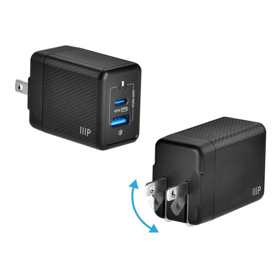 The Monoprice Compact 2-Port 45W GaN Charger is an all-in-one powerhouse that charges multiple devices. With USB Power Delivery technology, the Type-C port supplies up to 45W that’s more than enough to fast charge popular full-sized laptops, like the MacBook Pro, MacBook Air, Dell XPS, and Lenovo ThinkPad. Its Intelligent Power Distribution technology automatically allocates the optimal amount of power to each connected device and can charge up to 2 devices simultaneously, including phones, tablets, and laptops. GaN technology increases power efficiency while shrinking the circuit size, providing a compact architecture perfect for fitting into small spaces or taking with you on the go. The folding prong design is there for easy and travel-friendly packing. Our chargers are tested and certified by independent ETL-certified labs to ensure safe performance and protection from overheating, overcharging, excessive current, and short circuits.