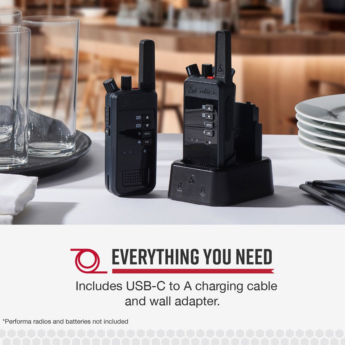 Is your company using Cobra® Performa 400 or 450 LMR 2-way handheld business radios? Charge your radio and an extra battery with this handy single-radio desktop dock from Cobra®. Like the radio itself, this dock is of sturdy construction for heavy use and tough environments. It comes with a USB-C® to USB-A charging cable as well as its own wall adapter.