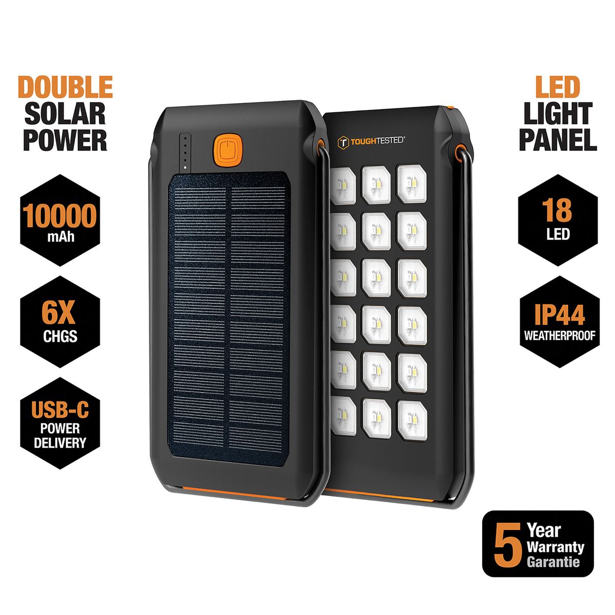 The ToughTested 10,000-mAh LED Solar Power Bank Light combines a powerful work light with a solar power bank to create a versatile piece of equipment for the home, workshop, garage, or campsite. The high-intensity LED panel light with flip-open stand makes it easy to direct the light where you need it. Power outage? No problem; this will light up a room with ease. The power bank can quickly recharge your smartphone or any other USB device and the built-in solar panel lets you recharge when you are off grid.