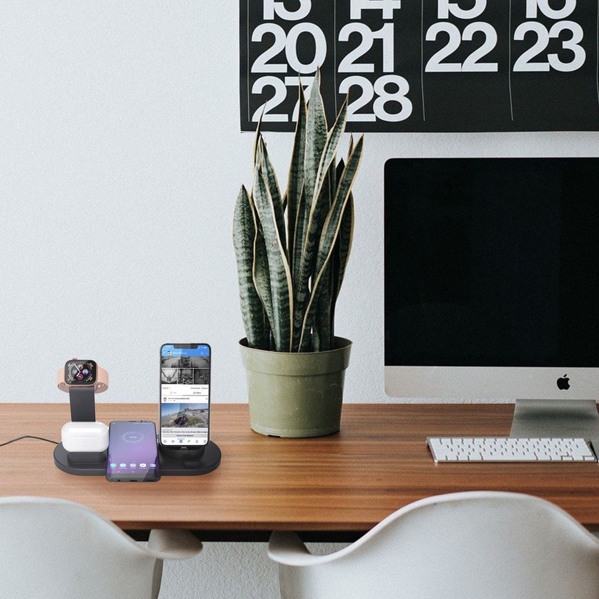 Organized and tidy up desk spaces with the Trexonic Wireless 4 in 1 Multi-functional Charge Station Organizer. The highly adaptable station charges most devices such as smart phones, smart apple watches, airpods, tablets and more. The three way rotating charging dock is available for type C, micro usb, and apple lighting devices. Want to charge wireless? No worries, just place the desired device flat on the center of the station for wireless charging connectivity. As long as there is metal case or credit card case in between, phone can be conveniently charged wirelessly. Being a multi-functional station, airpods and Apple Watches can be charged alongside phones with their own separated charging ports. Its design to keep as many cables out of the way as possible for extra space on the desk or table. The silicone based material prevents from scratching up any devices and provides quality style for any setup. Contains safe over charge protection technology, prevents overheating batteries and from over voltage damages. Neatly organize night stands, desks, home offices or other work place for your personal devices!