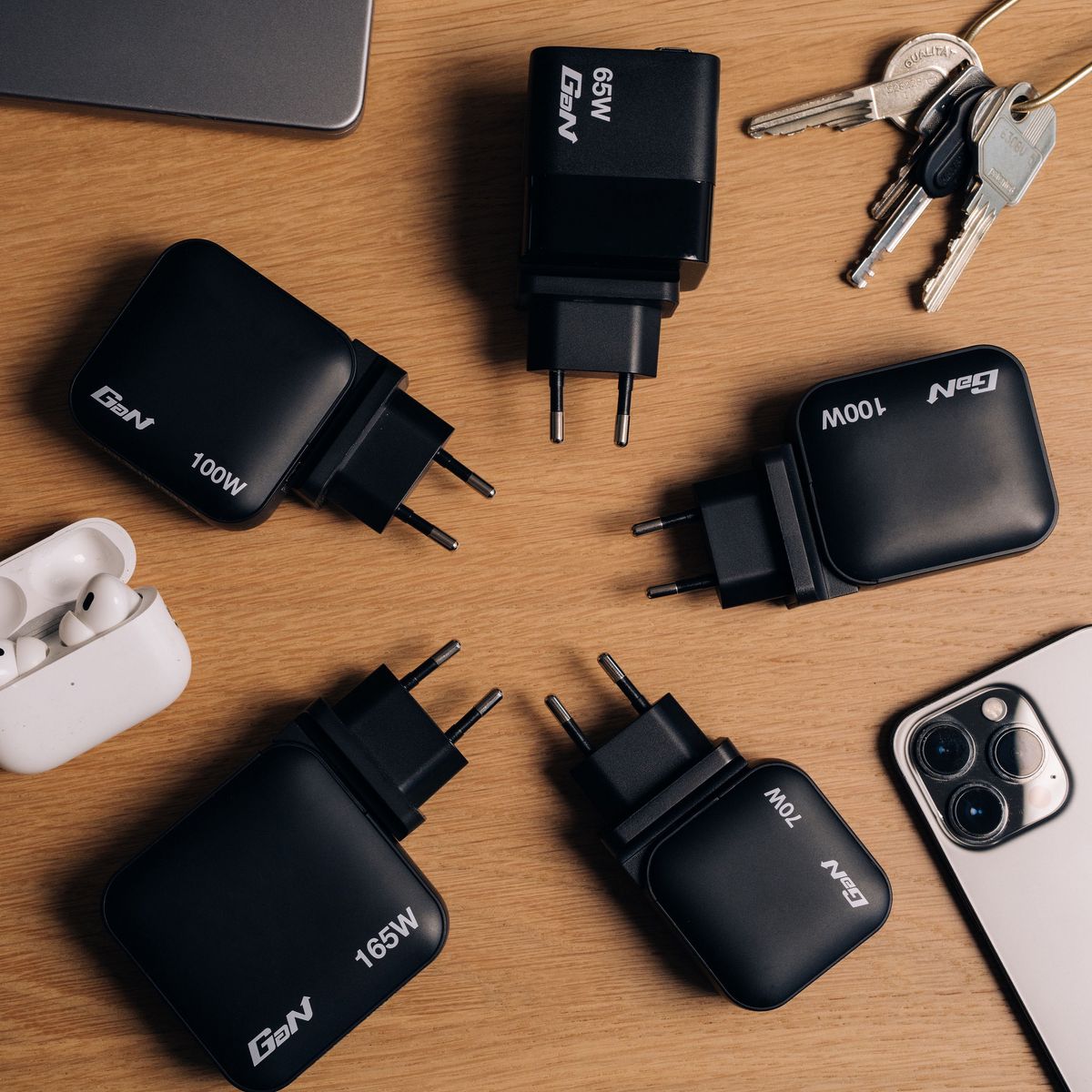 The Vertbatim® 100-Watt Mini GaN Charger combines 3 USB-C® and 1 USB-A port into a compact, pocket-sized design. Capable of charging up to 4 devices simultaneously, the USB-C® ports support PD 3.0 (Power Delivery) at 100 watts, with 1 supporting PD 3.0 at 20 watts, while the USB-A port supports QC 3.0. This mini GaN charger features an advanced chipset that allows for an even more compact design than regular GaN chargers without sacrificing power. This innovative technology not only reduces the charger's size but also minimizes heat generation, delivering safer and more efficient charging in a portable form factor. This charger supports USB Power Delivery 3.0, PPS, and Quick Charge 3.0, 4, and 4+ standards. The compact design of this charger includes foldable US prongs, and replaceable EU and UK plugs, making it ideal for the office, home, or traveling to power your laptop, tablet, smartphone, gaming devices, and more. Built from flame-resistant polycarbonate, the 100-Watt Mini GaN Charger comes in eco-friendly packaging with a 1-year warranty.