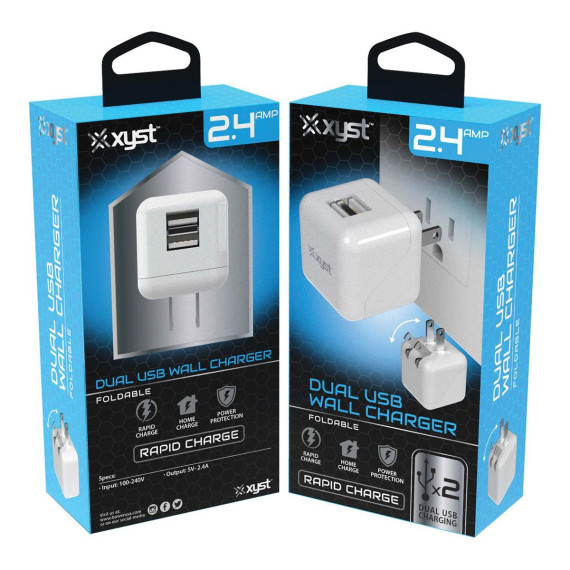 With a heat-resistant and anti-throw design, this White dual USB Wall Charger from XYST is compact and easy to carry, features a comfortable grip, and is suitable for use at home, office, traveling, and business trips. The intelligent dual port automatically recognizes and assigns the most effective current to your cell phone and tablets. The USB charger interface adopts an integrated injection molding technology, which is more robust and durable. The dual USB port output allows you to charge 2 devices and save time. The USB plug is the ideal fit for most cell phones, tablets, MP3 players, digital cameras, and other USB devices.