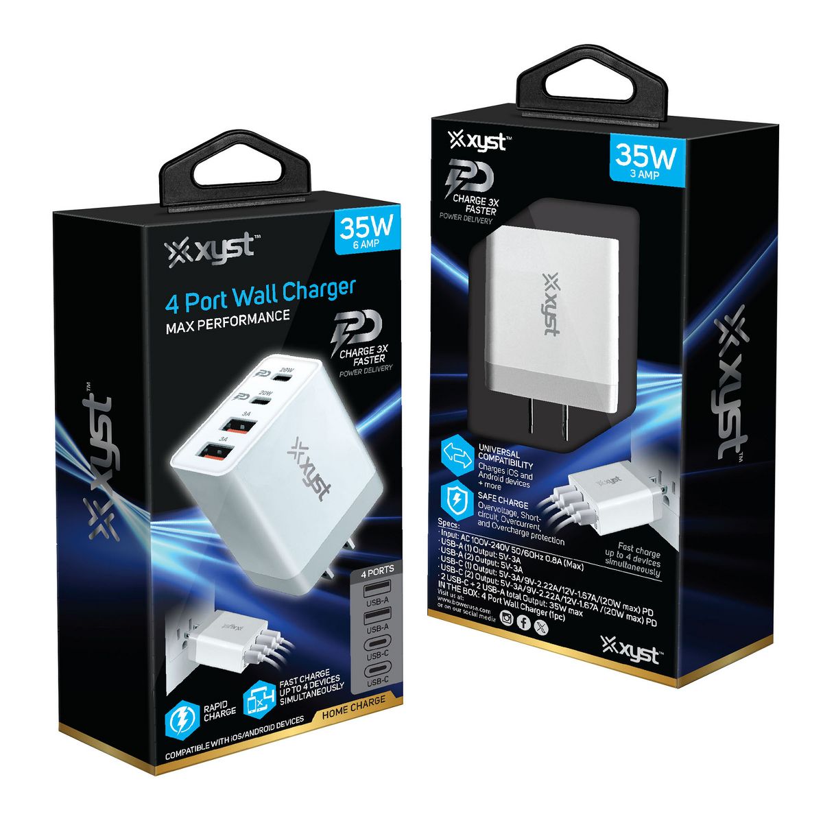 The XYST™ 4-Port USB Wall Charger is the ultimate solution for anyone looking to charge multiple devices quickly and efficiently. Designed for maximum performance, this compact charger features 2 USB-A and 2 USB-C® ports, providing a total output of 35 watts. The USB-C® ports offer Power Delivery (PD) with up to 20 watts max output, ensuring your devices charge rapidly. Whether you’re at home, in the office, or on the go, this charger allows you to fast-charge up to 4 devices simultaneously, minimizing downtime and keeping all your gadgets ready for use. The universal AC input range of 100 volts to 240 volts makes it ideal for international travel. Its sleek and durable design ensures it can withstand daily use, making it a reliable accessory for all your charging needs. With the 4-Port USB Wall Charger, you’ll experience the convenience of having a single charger for all your devices, ensuring they are always powered up and ready to go.