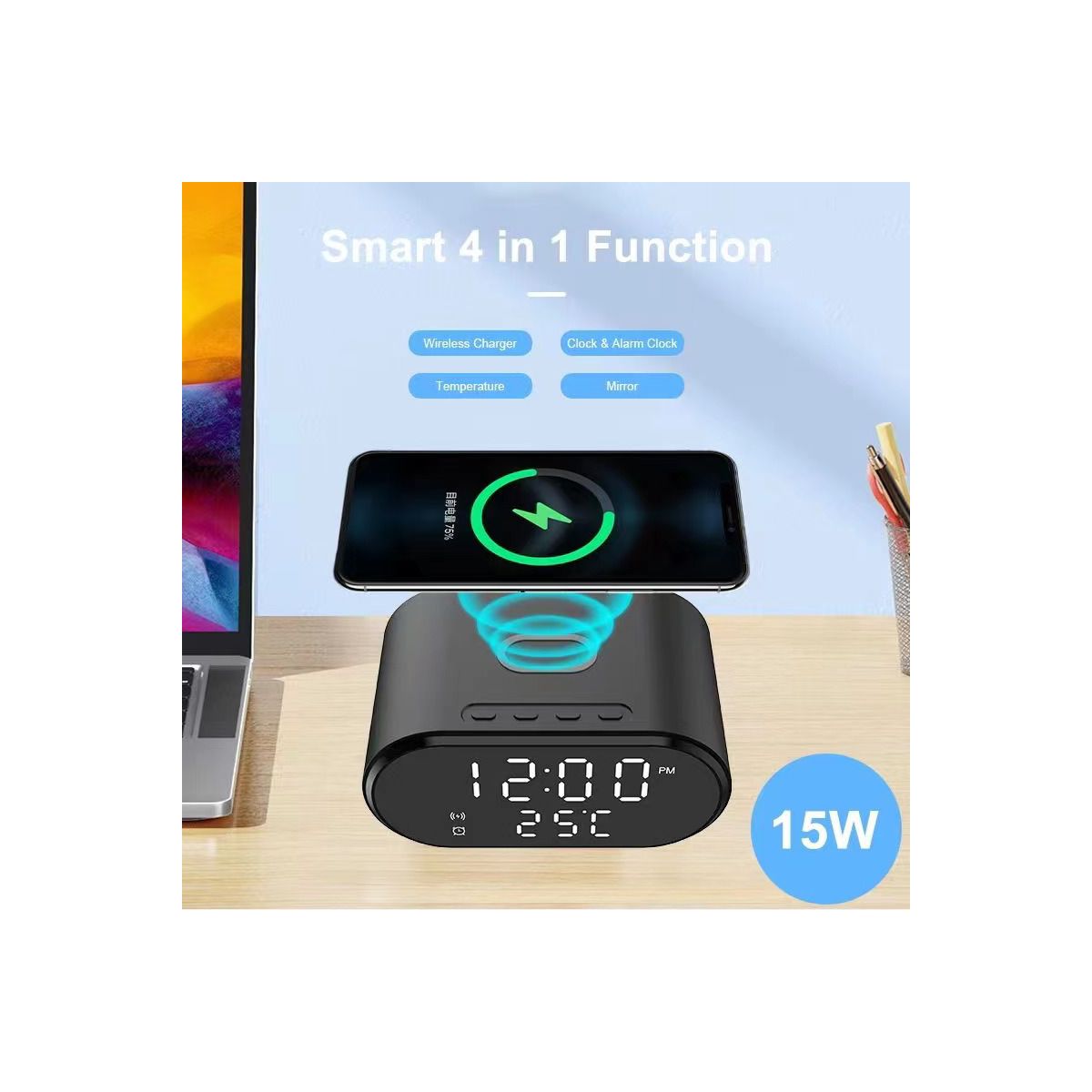 Designed with compactness in mind, ZTECH Wireless Charger Clock offers wireless charging convenience alongside a contemporary digital clock display. Experiencing the convenience of wireless charging for your phone and the elegance of a digital clock in one stylish package.This charging station also supports a wide range of Qi-enabled devices, making it a versatile charging solution for various smartphone models!