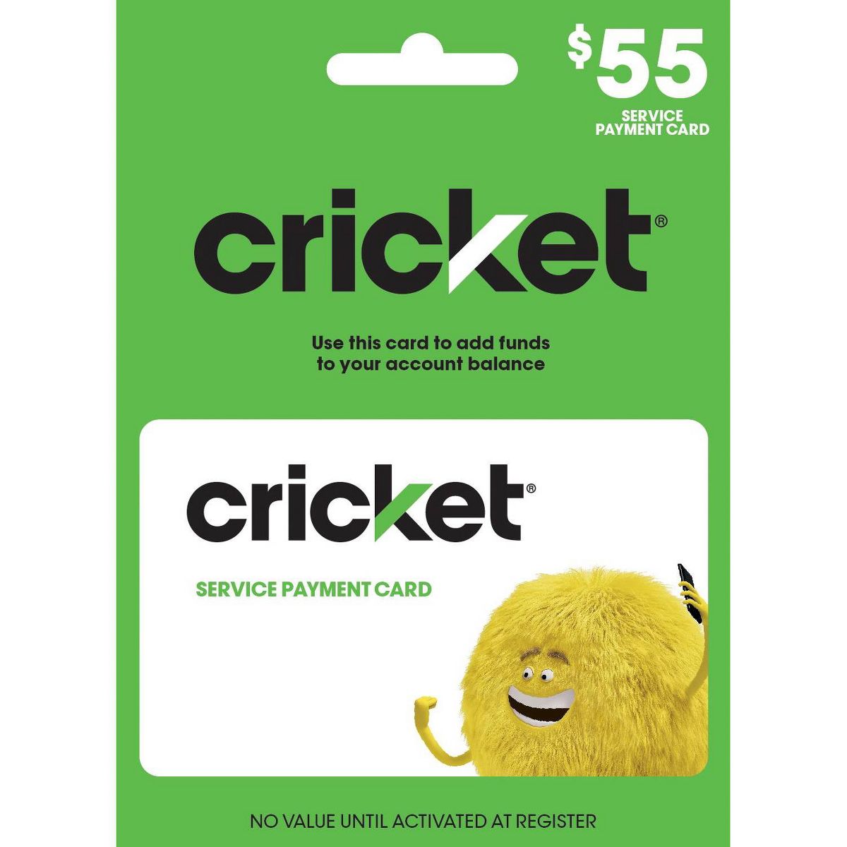 This card may only be used to add value to the Cricket Wireless account associated with your phone number. By purchasing, redeeming, or using this card you agree to the Cricket Wireless Terms and Conditions of Service available at cricketwireless.com/terms – including your agreement to dispute resolution by binding individual arbitration instead of jury trials or class actions. The entire value of this card will be applied to the charges, taxes, and fees of the Cricket Wireless account associated with your phone number during the activation process. There is no refund once this card’s value is applied to your Cricket Wireless account and Cricket does not provide or accept refunds of this card. This card is one-time use. The value associated with this PIN number and your Cricket Wireless account balance are nonrefundable, nontransferable, and cannot be exchanged for cash or any cash equivalent. Cricket is not responsible for lost, stolen, or damaged cards or PINs. Services and features are available for 30 days upon payment of the rate plan charge. Coverage, services, and speeds are not available everywhere. Cricket rate plans that include a high-speed data access allowance will have speeds slowed to a maximum 128Kbps for the remainder of the billing cycle after the allowance is used. For current network performance info and for network practices, please visit cricketwireless.com/mobilebroadband. Current rates, coverage areas, and other important information regarding your Cricket Wireless service are available by visiting cricketwireless.com, a Cricket retailer, or by calling Customer Care at 1-800-CRICKET. © 2024 Cricket Wireless LLC. All rights reserved. Cricket and the Cricket logo are registered trademarks under license to Cricket Wireless LLC.