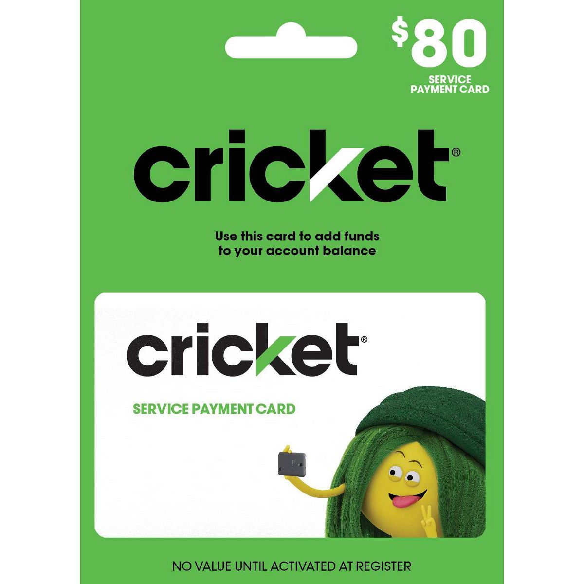 This card may only be used to add value to the Cricket Wireless account associated with your phone number. By purchasing, redeeming, or using this card you agree to the Cricket Wireless Terms and Conditions of Service available at cricketwireless.com/terms – including your agreement to dispute resolution by binding individual arbitration instead of jury trials or class actions. The entire value of this card will be applied to the charges, taxes, and fees of the Cricket Wireless account associated with your phone number during the activation process. There is no refund once this card’s value is applied to your Cricket Wireless account and Cricket does not provide or accept refunds of this card. This card is one-time use. The value associated with this PIN number and your Cricket Wireless account balance are nonrefundable, nontransferable, and cannot be exchanged for cash or any cash equivalent. Cricket is not responsible for lost, stolen, or damaged cards or PINs. Services and features are available for 30 days upon payment of the rate plan charge. Coverage, services, and speeds are not available everywhere. Cricket rate plans that include a high-speed data access allowance will have speeds slowed to a maximum 128Kbps for the remainder of the billing cycle after the allowance is used. For current network performance info and for network practices, please visit cricketwireless.com/mobilebroadband. Current rates, coverage areas, and other important information regarding your Cricket Wireless service are available by visiting cricketwireless.com, a Cricket retailer, or by calling Customer Care at 1-800-CRICKET. © 2024 Cricket Wireless LLC. All rights reserved. Cricket and the Cricket logo are registered trademarks under license to Cricket Wireless LLC.