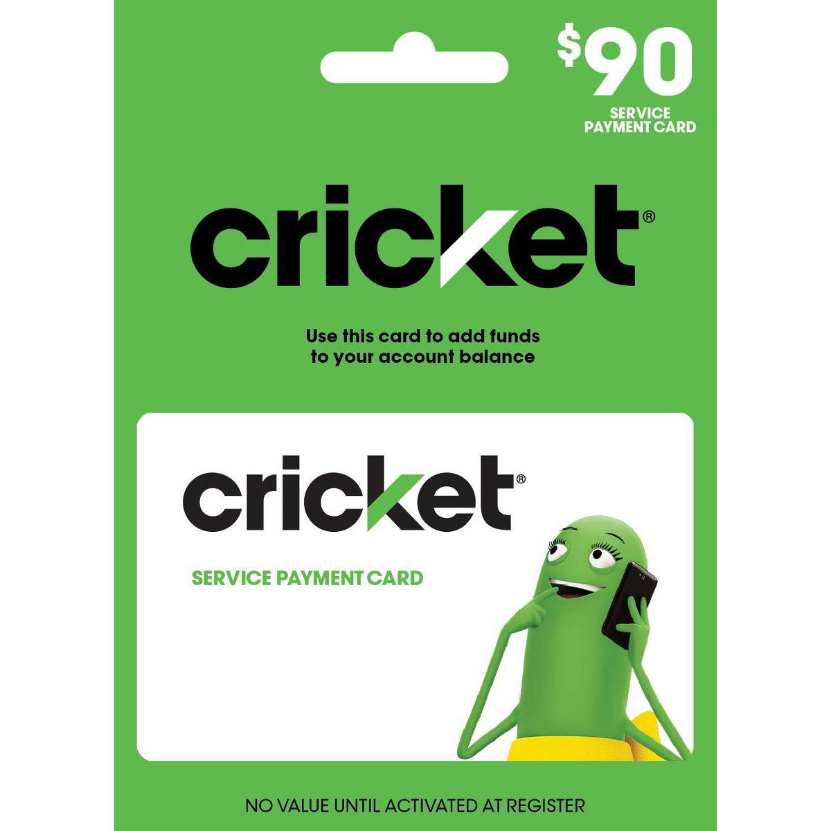 This card may only be used to add value to the Cricket Wireless account associated with your phone number. By purchasing, redeeming, or using this card you agree to the Cricket Wireless Terms and Conditions of Service available at cricketwireless.com/terms – including your agreement to dispute resolution by binding individual arbitration instead of jury trials or class actions. The entire value of this card will be applied to the charges, taxes, and fees of the Cricket Wireless account associated with your phone number during the activation process. There is no refund once this card’s value is applied to your Cricket Wireless account and Cricket does not provide or accept refunds of this card. This card is one-time use. The value associated with this PIN number and your Cricket Wireless account balance are nonrefundable, nontransferable, and cannot be exchanged for cash or any cash equivalent. Cricket is not responsible for lost, stolen, or damaged cards or PINs. Services and features are available for 30 days upon payment of the rate plan charge. Coverage, services, and speeds are not available everywhere. Cricket rate plans that include a high-speed data access allowance will have speeds slowed to a maximum 128Kbps for the remainder of the billing cycle after the allowance is used. For current network performance info and for network practices, please visit cricketwireless.com/mobilebroadband. Current rates, coverage areas, and other important information regarding your Cricket Wireless service are available by visiting cricketwireless.com, a Cricket retailer, or by calling Customer Care at 1-800-CRICKET. © 2024 Cricket Wireless LLC. All rights reserved. Cricket and the Cricket logo are registered trademarks under license to Cricket Wireless LLC.