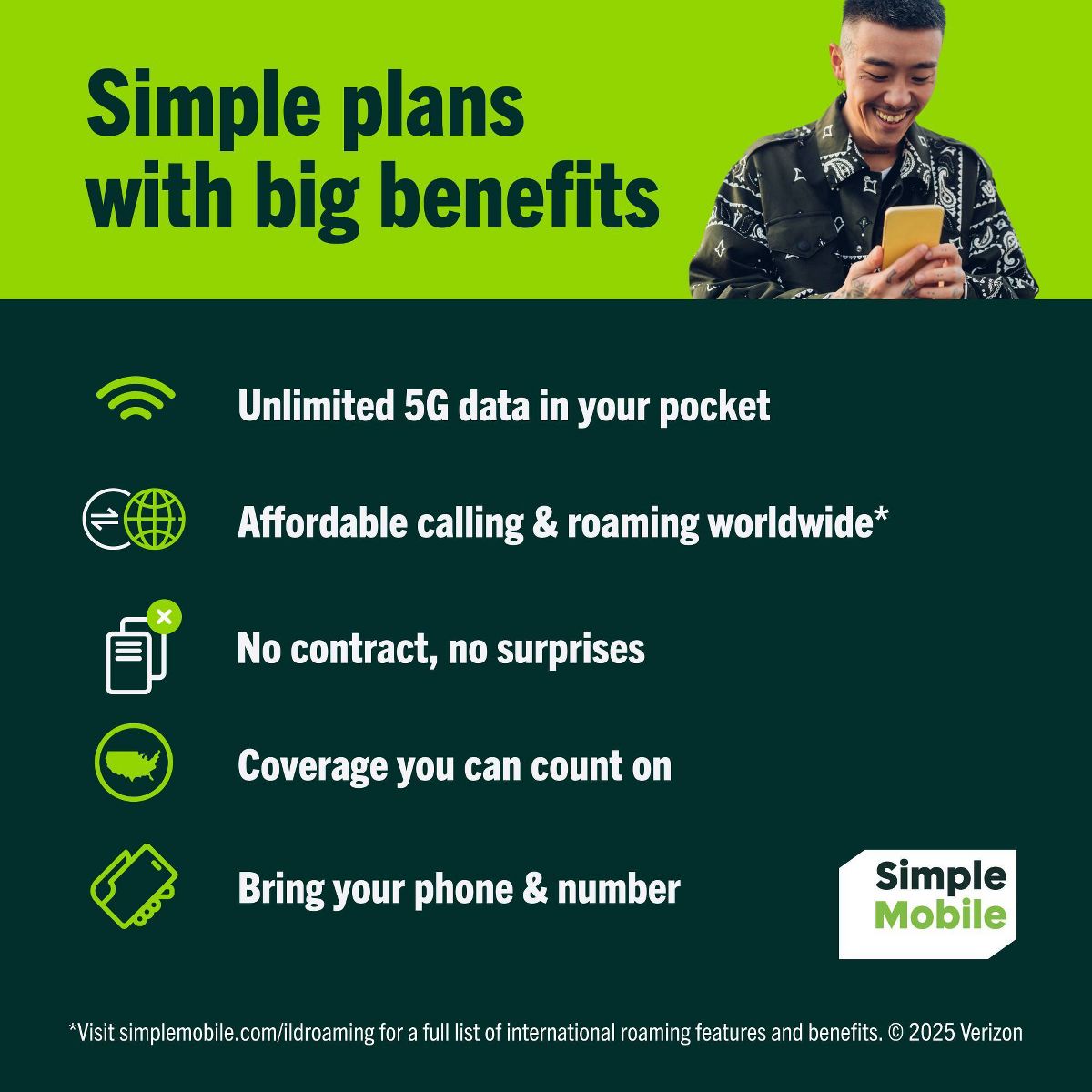 » International roaming is available in select countries; subject to change. When roaming within the select countries, includes:1) unlimited text; 2) unlimited calling within Mexico and from Mexico to the U.S.; 3) 300 minutes of calling within the roaming country and to the U.S.; and, 4) 5GB of data. Not for extended international use; primary usage must occur in the US. Device must be registered and used on our US network before international use. For a complete list of countries, feature benefits and to see complete Terms and Conditions of Service please visit Simple Mobile website