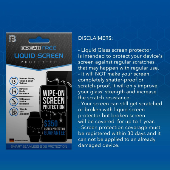 BREAK FREE Liquid Screen Protection was formulated in Germany utilizing cutting-edge Nano SiO2 technology to coat and protect all types of mobile device screens seamlessly. Silica Dioxide (SiO2) is mainly nanoparticles of glass suspended in a transparent liquid coating. Once applied, BREAKFREE creates a seamless, invisible protective layer of liquid glass that bonds to any glass device screen at a microscopic level. The results are significant; with an increase of the screen hardness to 9H, BREAK FREE will help reduce screen surface scratches and screen breaks due to accidental drops. Liquid screen protector is intended to protect your device's screen against regular scratches that may happen with regular use. It will NOT make your screen completely shatter-proof or scratch-proof. It will only improve your glass' strength and increase the scratch resistance. Your screen can still get scratched or broken with a liquid glass screen protector. To activate your screen protection coverage, register your device on BREAKFREE's website within 30 days of purchase. Exceptions cannot be made. All claims should also be submitted through the same website.