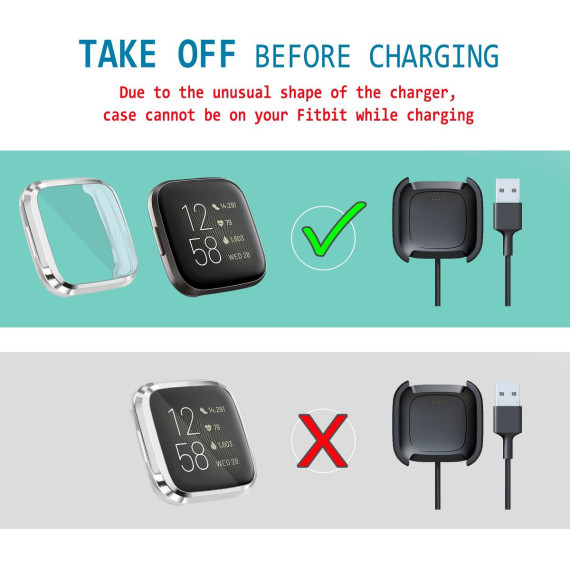 All around surface protection case for your Fitbit Versa 2. Absorbs shock from knocks and drops to protect your watch. More than a defense, screen protector is dustproof and anti-chip too. High touch-sensitivity keeps your screen’s optimum responsiveness. HD Clarity restores visual clearness of the screen. Ergonomically designed with ultrafine dots that cannot be seen by the naked eye, it prevents water marks and sticking to the screen. Perfect for protecting your watch in high-powered activity such as sports, while also suitable for daily use. Precise cutouts for an easy access to all buttons, sensors, and watch features. Easy to install. Just position correctly on top of your Fitbit and apply pressure. Case is then snugly fitted on your watch. Frame Color: Silver. Due to the unusual shape of the Versa 2’s charger, kindly remove the case before charging. Not compatible with Fitbit Versa / Versa Lite / Versa SE. Item is just a cover case, Fitbit not included.