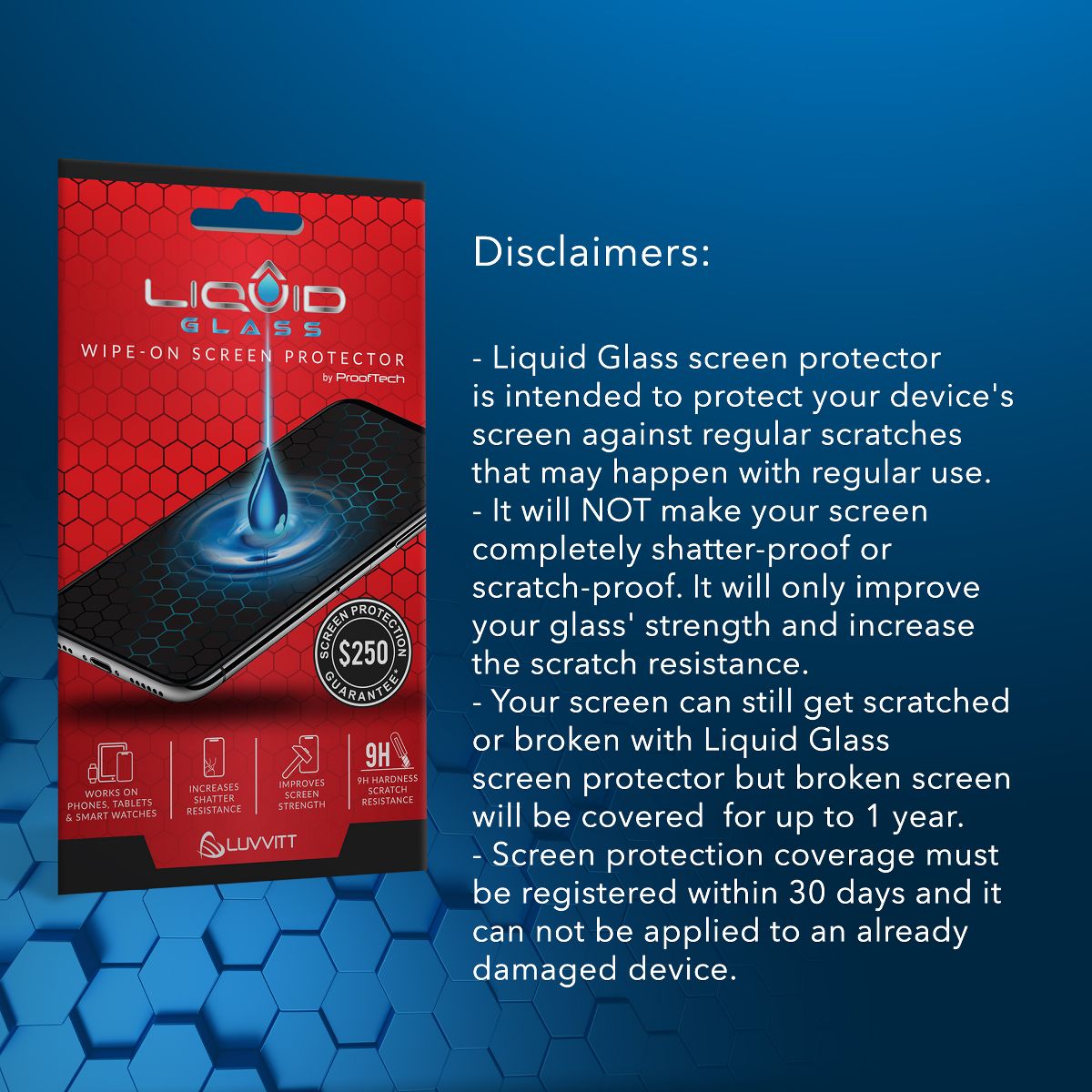 Liquid Glass is an advanced technology, invisible, wipe-on screen protector that bonds to the glass of your device offering enhanced scratch, moisture, and impact resistance. Made of silica dioxide (Si02) Liquid Glass is essentially microscopic particles of glass suspended in a liquid solution. Easy, wipe-on application makes the application a breeze. Liquid Glass adds an additional extremely thin layer of glass that is highly scratch & shatter resistant and increases the glass' strength to 9 H hardness level. Liquid Glass screen protector protects your device's screen against regular scratches that may happen with regular use. It will NOT make your screen completely shatter-proof or scratch-proof. It will only improve your glass' strength and increase the scratch resistance. Your screen can still get scratched or broken with a liquid glass screen protector (it does not fix or repair exiting crack or scratches). To activate your screen protection coverage, register your device on ProofTech's website within 30 days of purchase. Exceptions cannot be made. All claims should also be submitted through the same website.