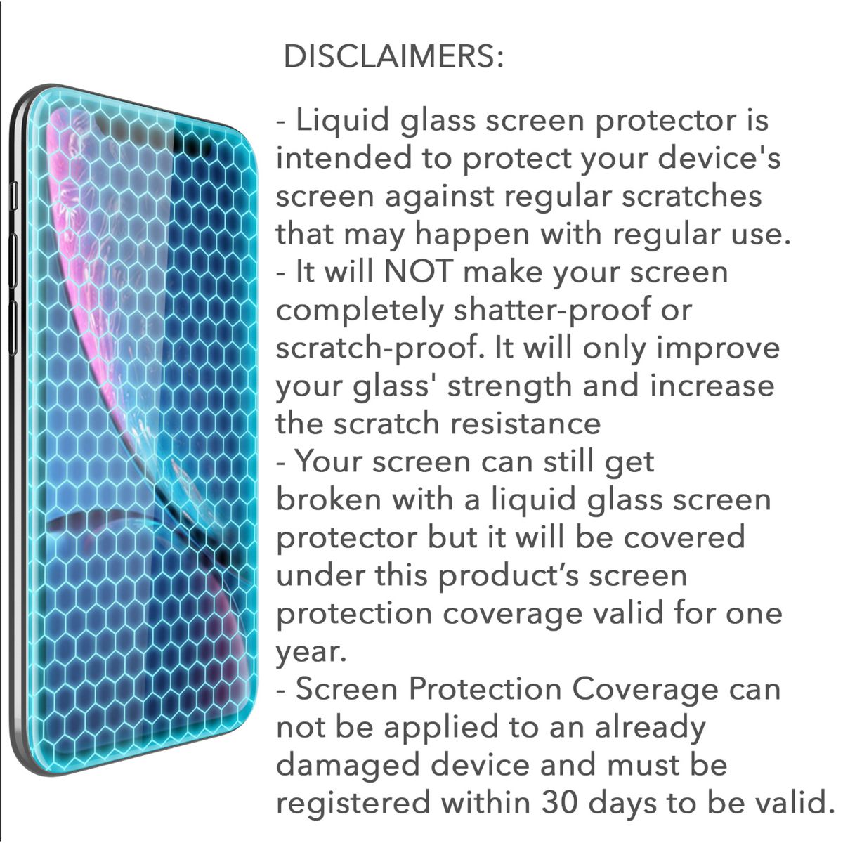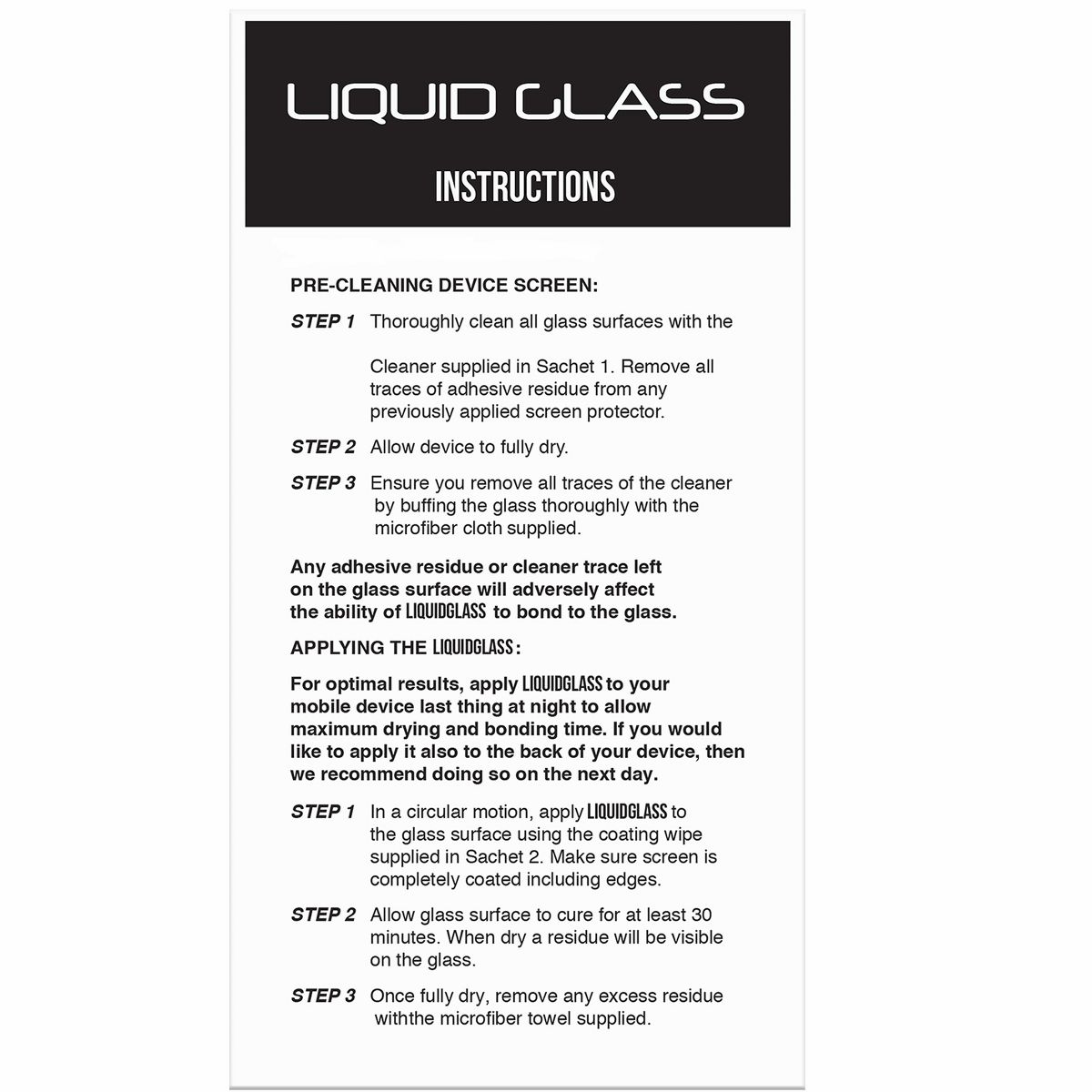 Liquid Glass is an advanced technology, invisible, wipe-on screen protector that bonds to the glass of your device offering enhanced scratch, moisture, and impact resistance. Made of silica dioxide (Si02) Liquid Glass is essentially microscopic particles of glass suspended in a liquid solution. Easy, wipe-on application makes the application a breeze. Liquid Glass adds an additional extremely thin layer of glass that is highly scratch & shatter resistant and increases the glass' strength to 9 H hardness level. Liquid Glass screen protector protects your device's screen against regular scratches that may happen with regular use. It will NOT make your screen completely shatter-proof or scratch-proof. It will only improve your glass' strength and increase the scratch resistance. Your screen can still get scratched or broken with a liquid glass screen protector (it does not fix or repair exiting crack or scratches). To activate your screen protection coverage, register your device on LUVVITT's website within 30 days of purchase. Exceptions cannot be made. All claims should also be submitted through the same website.
