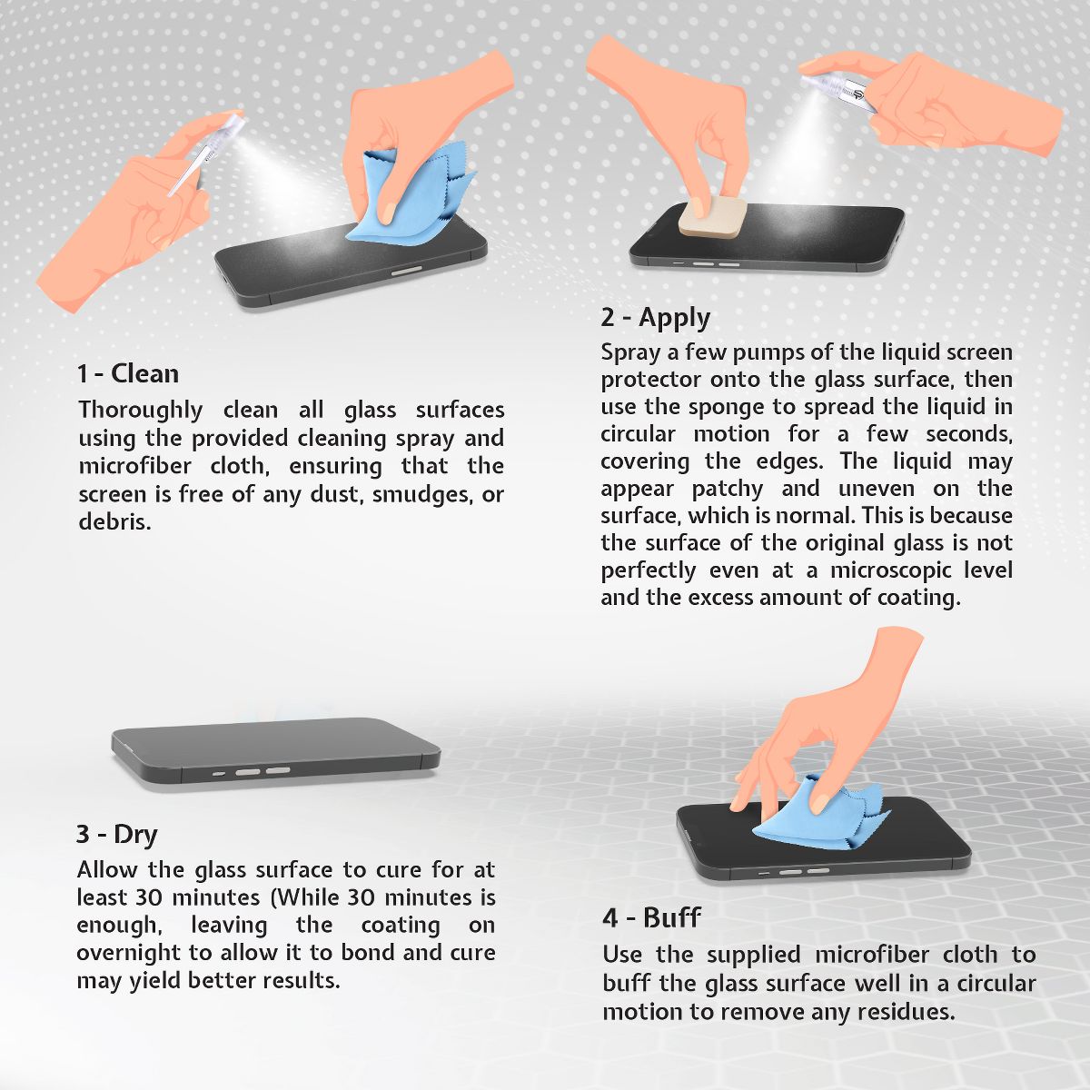 Introducing the game-changing SPRAY ON Liquid Glass Screen Protector, a substantial advancement in the arena of device screen protection. This exceptional protector arises from a unique blend of state-of-the-art SiO2 technology and a distinctive proprietary component. This outstanding combination outpaces the conventional methods, offering superior strength, durability, and remarkable resistance to scratches and cracks. It's not just a screen protector - it's an unnoticeable, formidable shield for your device. SPRAY ON's innovatively designed application process reinvents simplicity - just spray, spread, and protect. This user-friendly approach assures a perfect, bubble-free application, creating a virtually invisible, microscopic barrier that fits perfectly onto your device's screen. The protective solution forms an unbroken bond with your device's screen, establishing a resilient barrier against everyday wear and tear. Adding to SPRAY ON Liquid Glass Screen Protector's advantages is its impressive coverage capacity. With the ability to protect up to 10 devices, it stands as a cost-effective solution for tech aficionados or multi-device households. A notable feature of the SPRAY ON Liquid Glass Screen Protector is its comprehensive protection package. Each SPRAY ON kit comes with a high-end screen cleaning spray and a deluxe microfiber cloth. This perfect pair readies your device for an optimal bond of the protective solution, securing a pristine and perfect application. Setting aside the common difficulties of traditional screen protectors, our SPRAY ON design mitigates issues with alignment, bubbles, and trapped dust. The application process becomes a simple routine of spray, spread with the included sponge, and protect, ensuring a smooth finish. The result is a nearly invisible protective layer that encompasses every corner of your screen, providing complete coverage and superior protection against scratches and cracks. Embrace the future of screen protection with the SPRAY ON Liquid Glass Screen Protector. It's not just a product; it's a revolution in device safety, offering exceptional protection with incredible ease of use. Immerse yourself in the junction of pioneering technology and convenience, crafting the ultimate protective solution for your device. Welcome to the era of SPRAY ON – the new standard in screen protection.