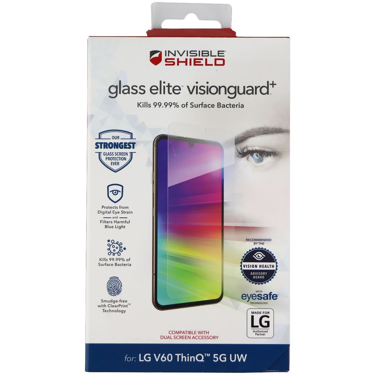 ZAGG (Glass Elite VisionGuard+) for V60 ThinQ 5G UW, provides clear, blue light filtering and tough screen protection.