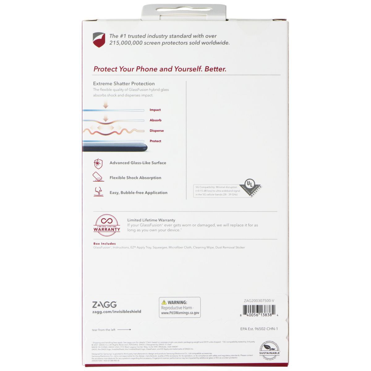 ZAGG InvisibleShield (GlassFusion+) for Samsung Galaxy S21 (5G) features hybrid glass for impact resistance and crystal-clear visuals.