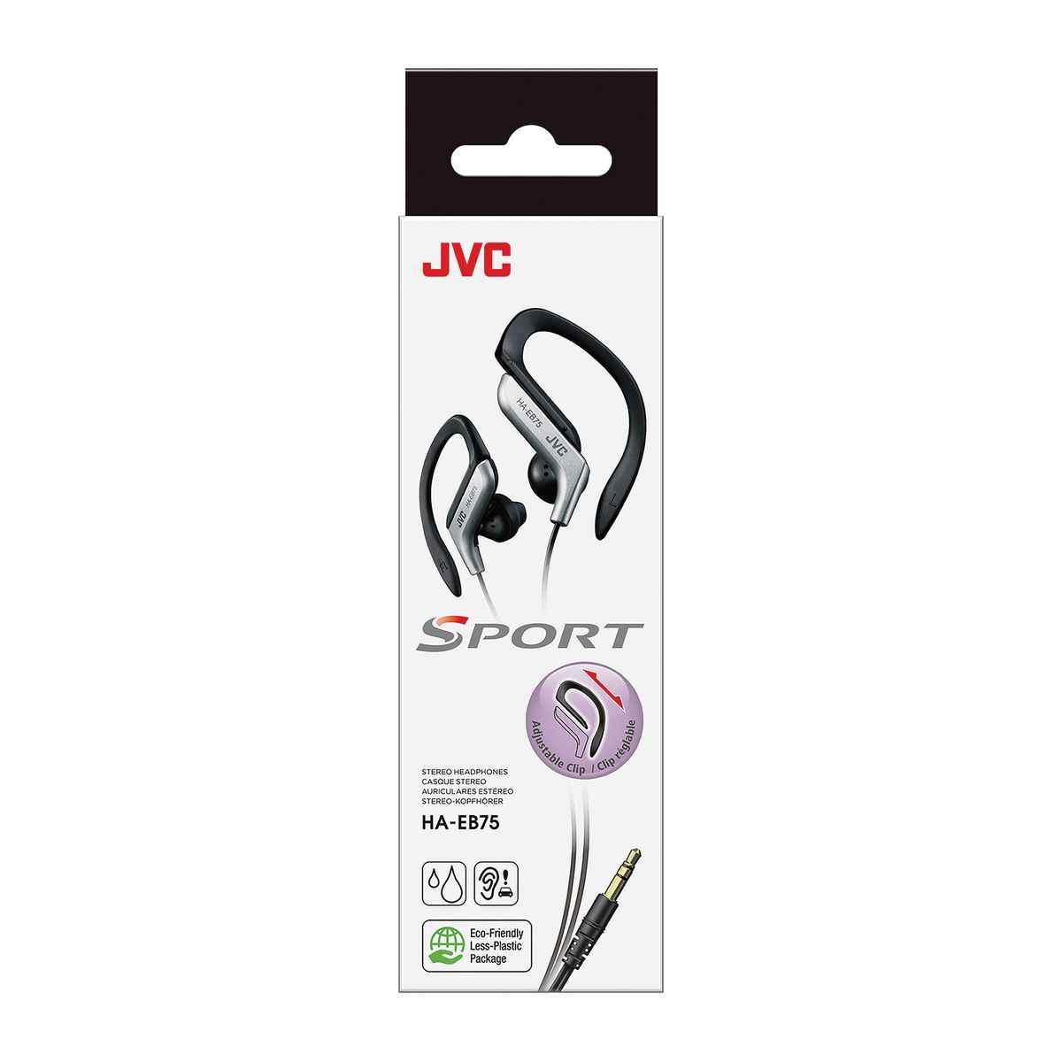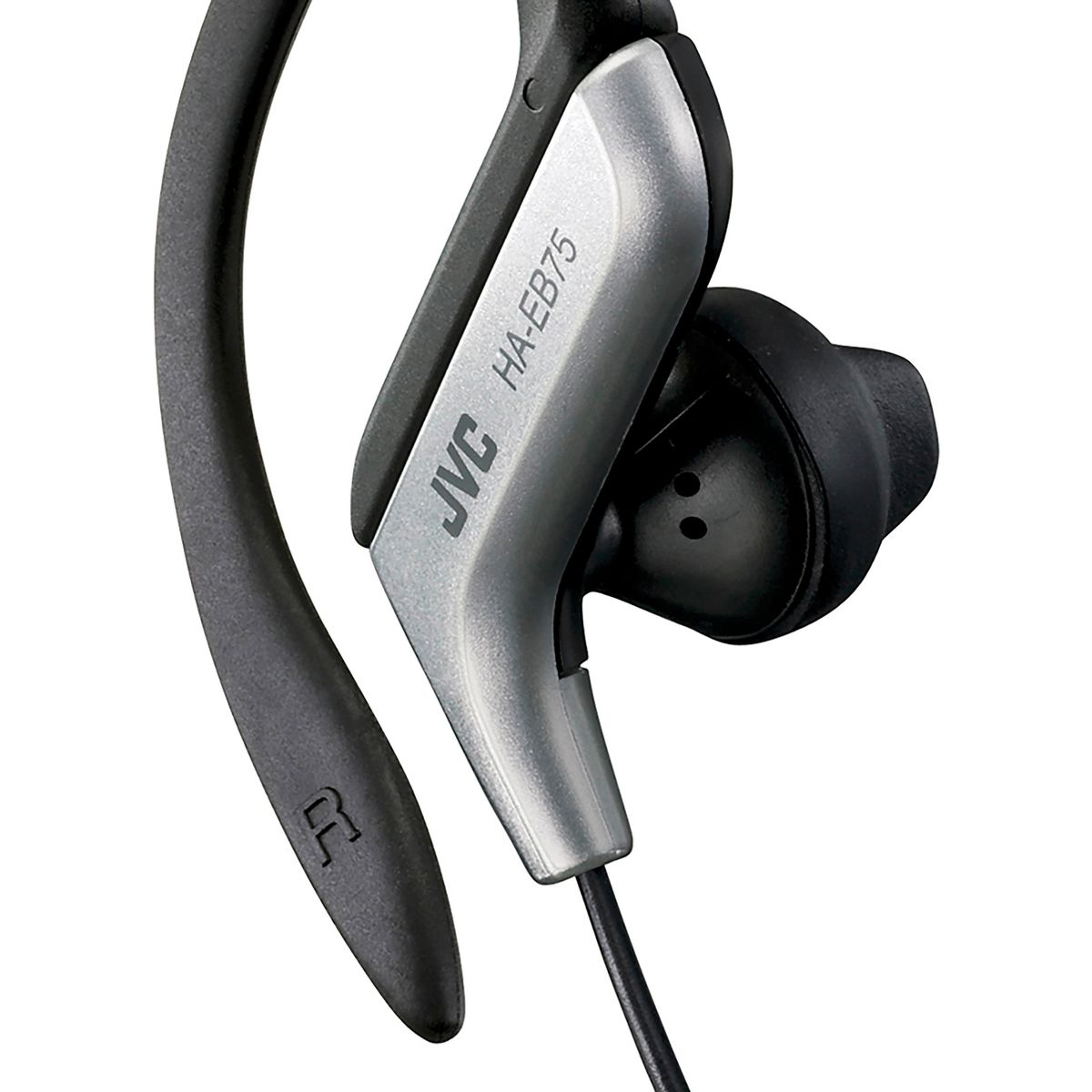 Designed for sports and other active use, the affordable JVC HA-EB75 splash-proof headphones incorporate a soft rubber ear clip that fits around the outer ear to hold the earbud in place. To ensure a comfortable and secure fit, the ear clip is adjustable, with a slide mechanism that offers five different positions to adjust to different size ears. To ensure high quality sound reproduction, a 0.53 in. (13.5mm) neodymium driver in each earpiece provides powerful sound with bass boost earpieces to deliver rich audio quality. Also, the water-resistant design helps protect the headphones from the elements. The headphones come with a 4 ft. (1.2m) friction noise reduction cord and an iPhone-compatible plug. The JVC HA-EB75 Ear Clip headphones come in 3 iPod matching colors: blue, black and silver.