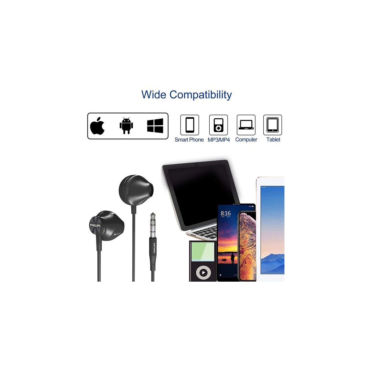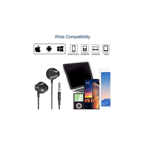PHILIPS Wired Earbuds with Mic, In-Ear Headphones, Ergonomic Comfort-Fit, Crystal Clear Sound, Passive Noise Isolation, Durable Cable, Black
