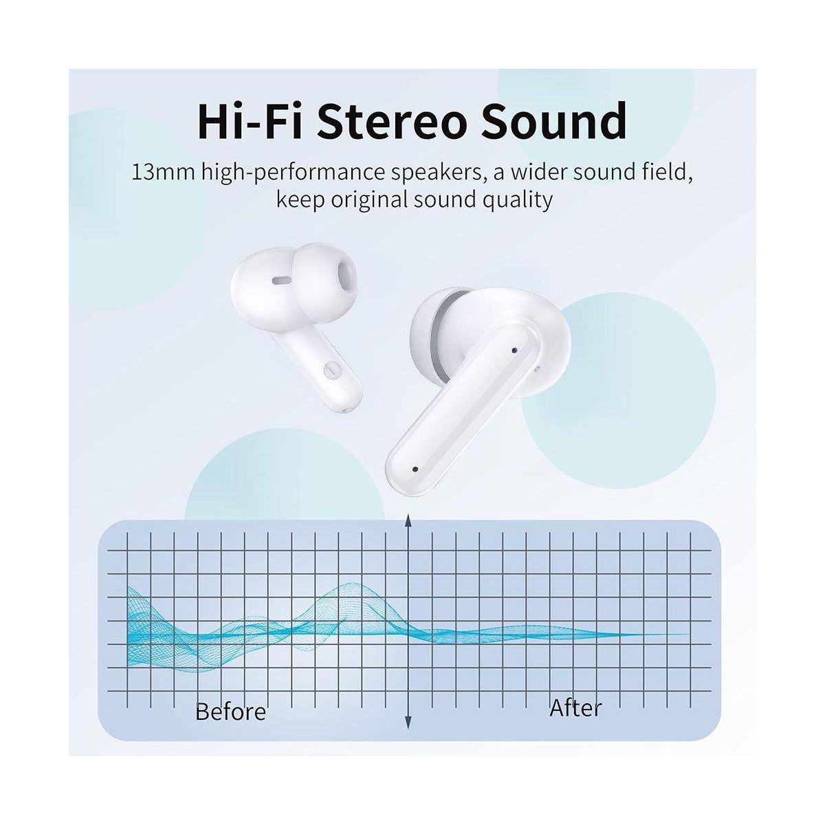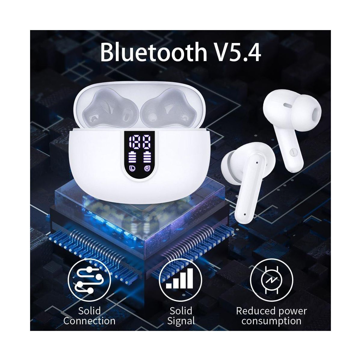 The wireless in-ear earbuds combine intuitive touch controls, exceptional 40-hour playtime, and studio-quality sound for an unparalleled listening experience. The ergonomic design with customizable silicone tips ensures all-day comfort, while the waterproof rating makes them ideal for workouts, travel, or daily commutes. With Bluetooth for seamless connectivity and dual-mic noise reduction for crystal-clear calls, the wireless In-Ear bluetooth earbuds deliver premium performance for music lovers, busy professionals, and fitness enthusiasts alike. The compact charging case adds convenience with rapid charging, ensuring your music never stops. You can enjoy 5-7 hours of continuous playback on a single charge and additional hours from the ultra-portable charging case. With low power, the earbuds can be quickly charged for an additional two hours of use in just 15 minutes. The dual LED display shows the remaining battery percentage of the charging case, and the LED indicator bar displays the charging status of each earbud. Equipped with a Bluetooth 5.4 chip, the wireless earbuds boast a transmission range of up to 15 meters, ensuring a more stable connection and maintaining a low latency. They offer data transfer speeds that are twice as fast as those of Bluetooth 5.3, while consuming 30% less energy.