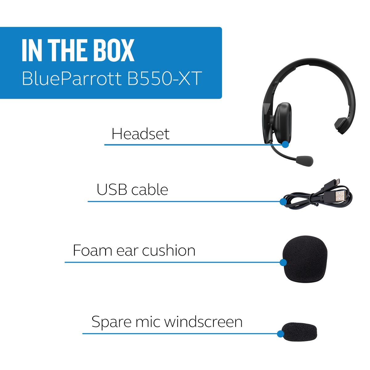 BlueParrott B550-XT is the all-day Bluetooth tucker headset that keeps you trucking for longer. Never cut a conversation short with 24 hours of talk time plus 500 hours of standby time. Featuring extra padding on the headband and a more cushioned earcup, the B550-XT gives you 24-hour comfort no matter the mileage. With an almighty mic that blocks out 96% background noise, you can take calls in peace from pick-up to drop-off. And when your job is hands-on, count on the B550-XT to let you get it done hands-free with 100% voice control for making calls, setting directions, or pulling up your favorite tunes. *play road trip playlist*