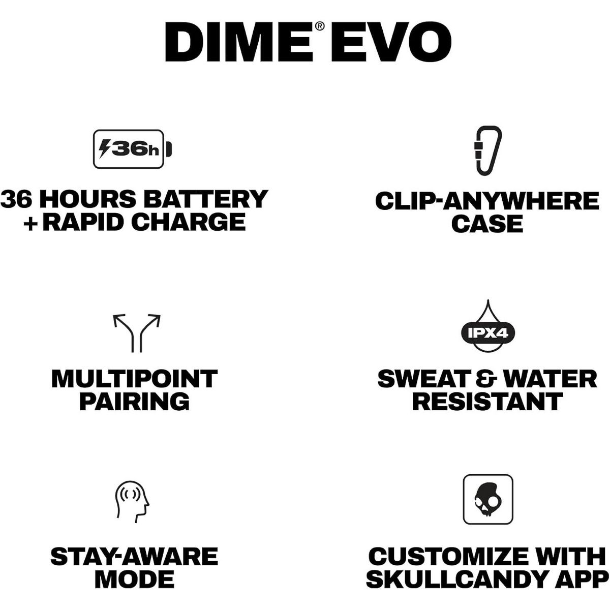 Skullcandy Dime Evo Wireless Earbuds, Bluetooth Headphones, Noise Isolating Fit, Up to 36 Hours Battery, Microphone, Easy Carry with Clip-Anywhere
