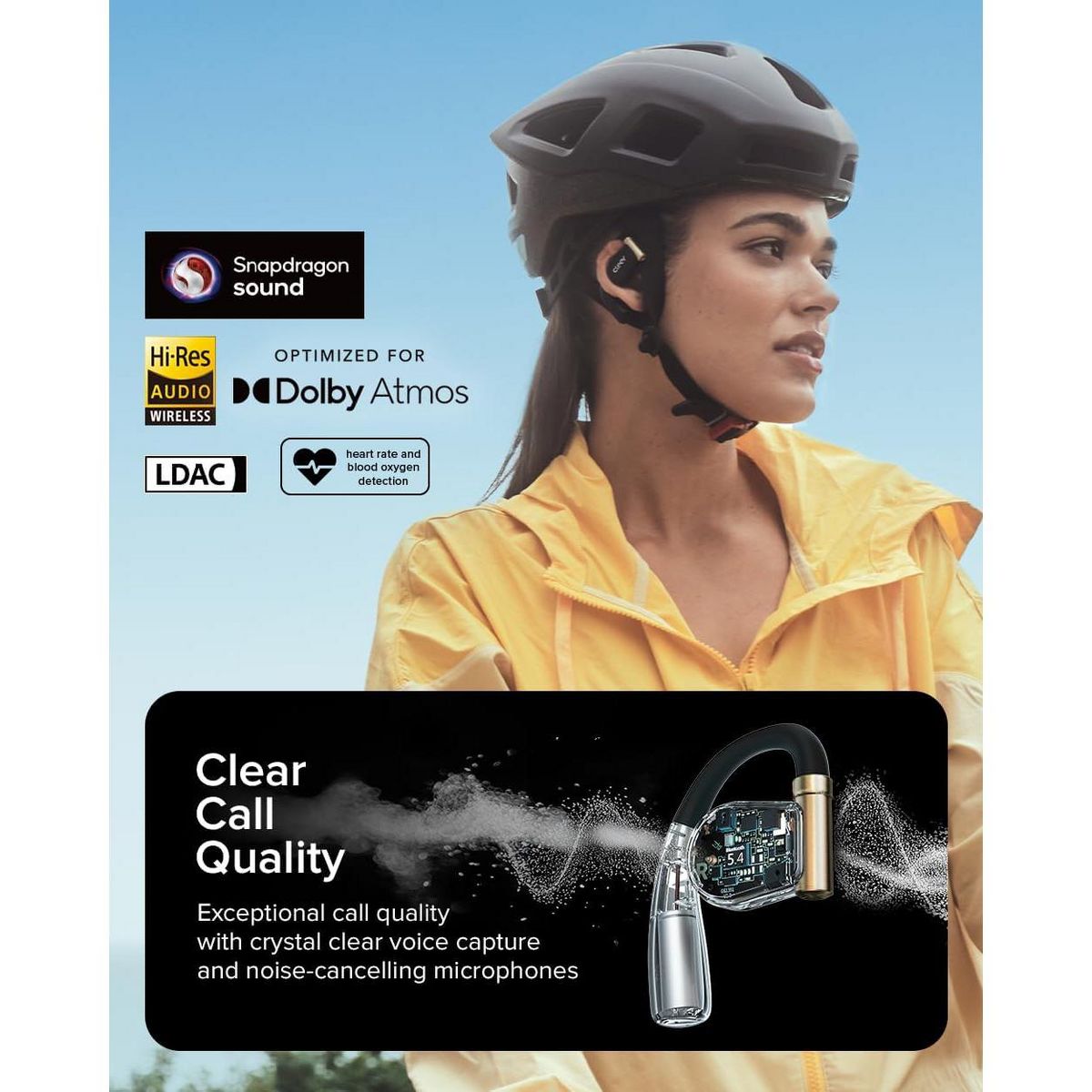 Arc 3 Sport Pro are our purpose built open-ear sport earbuds for active lifestyles. With a secure ear-hook design, the Arc 3 Sport Pro stay comfortably secure while keeping you aware of your surroundings. Track your workout performance with the built-in SPO2 sensor, measuring your blood oxygen levels and heart rate. Enjoy uncompromised audio quality and immersion with Snapdragon Sound and Dolby Atmos optimization. Get long term use with 8hrs of battery life per charge, and a Smart Touch Screen charging case that holds an additional 32hrs of battery.