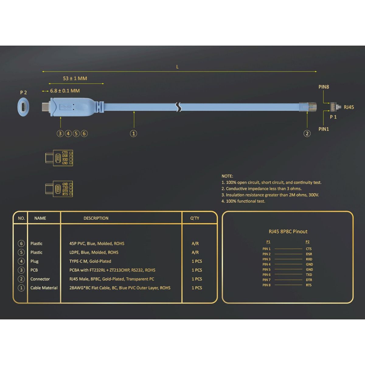 10ft USB-C to RJ45 8P8C Flat Serial Console Cable Compatible for Cisco Console Cable, Blue